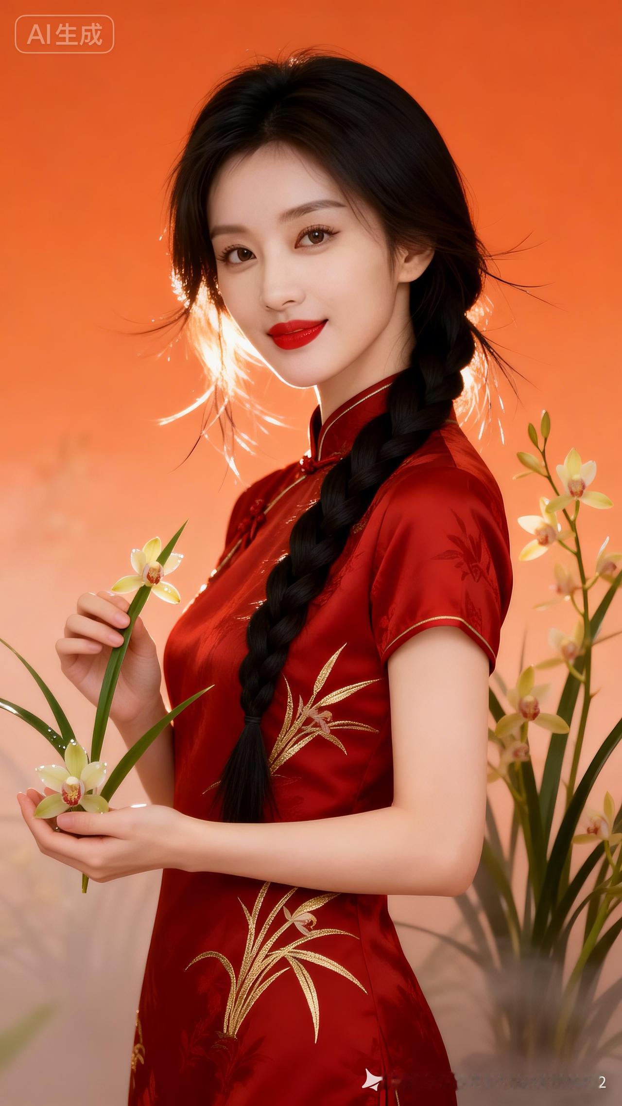 美女着新中式朱砂红旗袍,冷白皮少女梳黑长麻花辫,正红妆容明艳。侧身抬眸轻捻幽兰,金线兰草暗纹精致,暖调逆光鎏金发丝,高清,冷艳优雅新中式氛围感拉满。