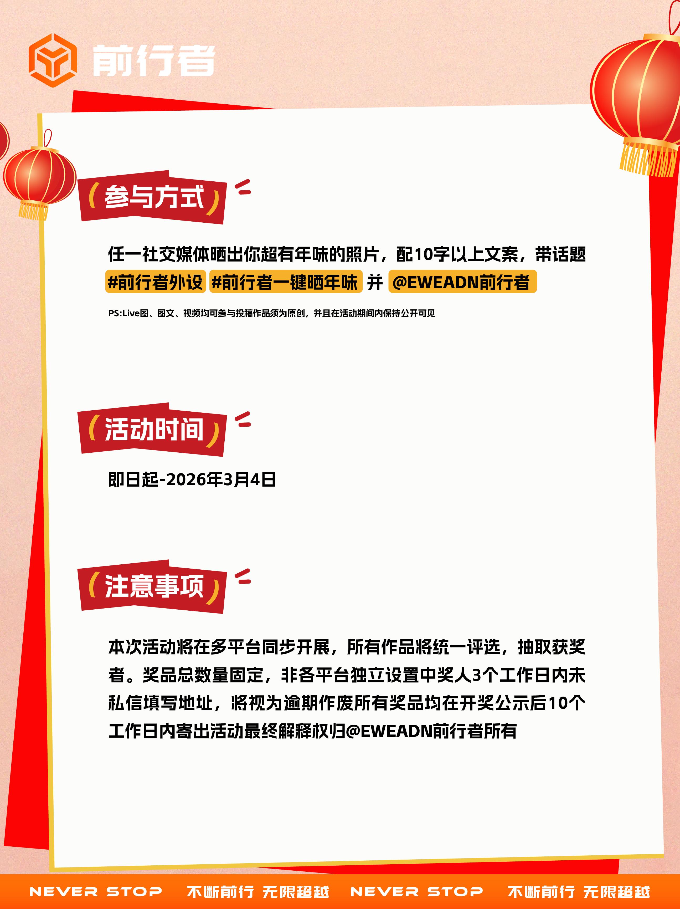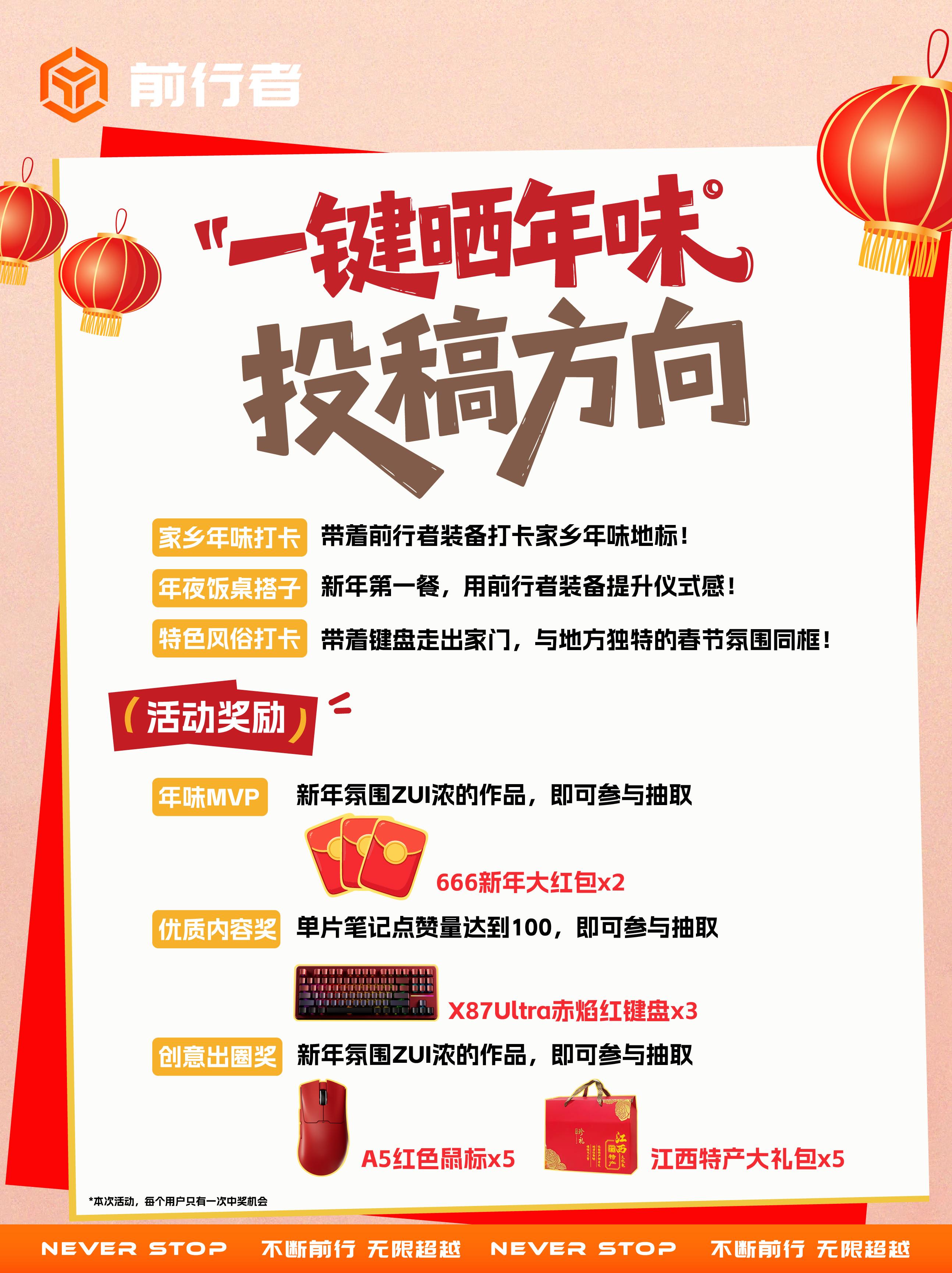 🎁前行者邀你一键晒年味 赢新年好礼。一键启新·年味共前行,这个新春,用你的前行者装备,创作最具创意的年味瞬间,让科技点亮传统,让好运从指尖开始! 📅内容方向: 家乡年味打卡:带着前行者装备打卡家乡年味地标! 年夜饭桌搭子:新年第一餐,用前行者装备提升仪式感! 特色风俗打卡:带着键盘走出家门,与地方独特的春节氛围同框! 🎁活动奖励:666新年红包 🚩活动时间:即日起-2026年3月4日 🖊️参与要求: 📸图文视频均可,带话题 前行者外设 前行者一键晒年味 并 EWE