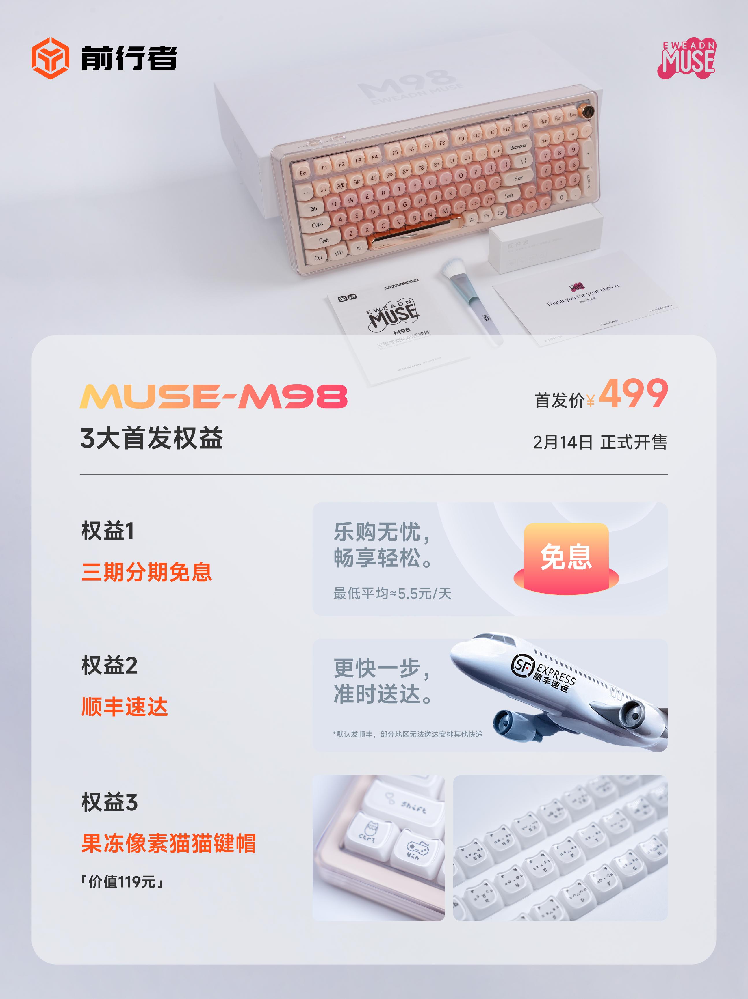 M98办公美学客制化键盘|预定开启中。从办公美学的纯粹初心出发——「前行者缪斯系列 M98」现已开启预定,2月14日正式开售 🌫 定制「粉底液」配色,赋予键盘低饱和的温柔仪式感 🔋1 万毫安电池持久续航,全天候静默陪伴,续航无忧 ⚙GASKET结构+五层消音填充,带来软弹手感与HIFI音感 🌈 1600万色沉浸光效,定义你专属的办公情绪律动 🔗三种连接模式,从容应对各类场景 不止是键盘,更是解锁你的温柔生产力工具 🎁本次有2位 抽 前行者Q9系列鼠标 别忘了关🐷EWEADN ,来
