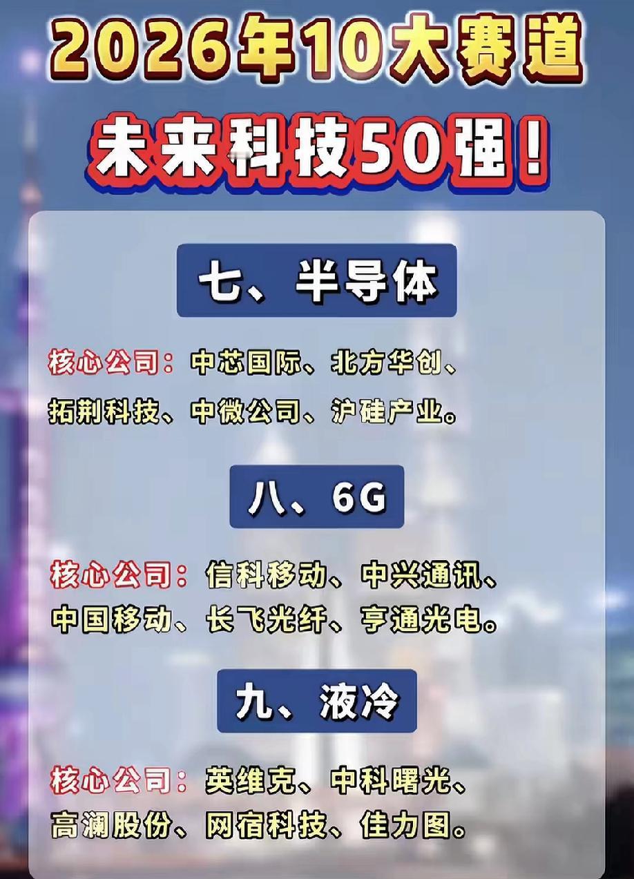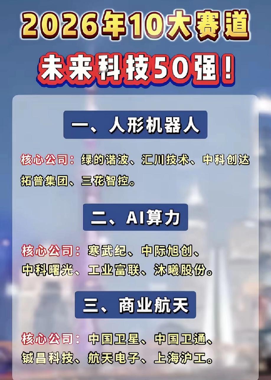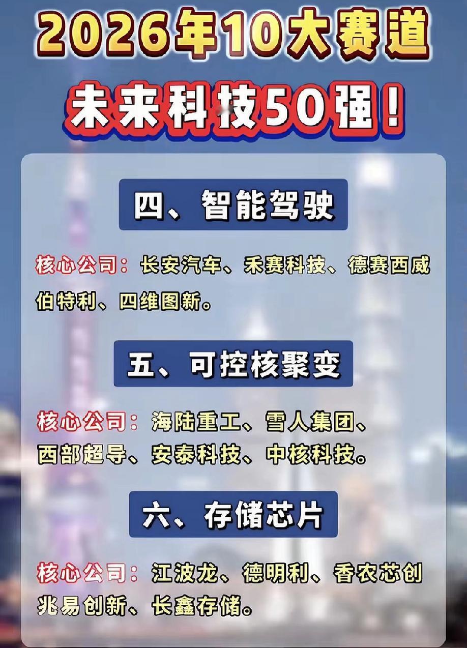 2026年未来科技10大赛道龙头名单曝光!从人形机器人到光刻机,从AI算力到可控核聚变,50家核心公司全梳理,精准锁定科技主线投资机会,收藏这一份就够了! AI算力核心逻辑:大模型迭代与AI应用爆发,算力需求呈指数级增长,GPU、服务器、光模块等基础设施成为核心瓶颈,国产替代空间巨大。行业龙头代表中科曙光。 存储芯片核心逻辑:AI服务器与消费电子复苏带动存储需求回暖,国产厂商在DRAM/NAND领域技术突破,行业周期触底回升。行业龙头代表长鑫存储。 人形机器人核心逻辑:工业自动化升级+人口老龄化催生劳动力替代需求。行业龙头代表拓普集团、三花智控…… ⚠️ 风险提示:以上分析仅为行业趋势梳理,不构成任何投资建议。科技行业技术迭代快、政策与市场波动大,投资需谨慎评估风险。