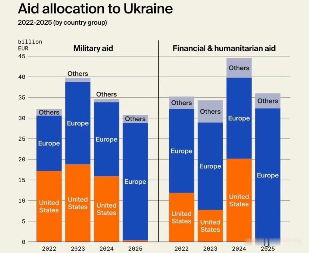 2022-2024,美国对乌克兰的军事援助,占总金额的一半左右,2025降至2% 财政和人道援助,Biden前两年支援一百亿左右、最后一年增加到两百亿,Trump上任砍为零 ​​​