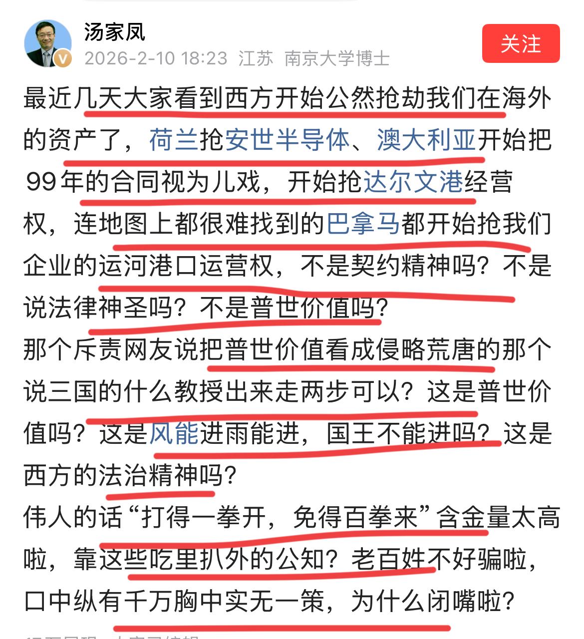 南京大学博士汤家凤发文警示,西方国家开始公然在全球抢我们的海外资源了!! 荷兰抢半导体,澳大利亚把合同视为儿戏,抢我们的港口,就连那个在地图上找不到的巴拿马也跳出来抢运河港口经营权!! 博士非常愤怒:这里是你们嘴里西方的自由民主,你们嘴里美西方的契约精神吗? 这就是公知,殖人说的普世价值吗? 确实,对他们有利就契约精神,对他们没有利,就弃约精神,甚至公然开始抢劫,这次是他们的自由精神!! 汤博士还公开喊话将三国的那位教授出来走两步,这是什么法制精神,解释一下~ 他奉劝公知从此闭嘴,老百姓已经觉醒,不好骗了~ 最惨的还是香港超人,一辈子做生意,从来没有失手,总是高瞻远瞩,运筹帷幄,嗅觉极为灵敏,但这次没有国家的帮助,感觉出大问题了,没想到最后阴沟里翻船,一辈子的英明毁在这么一个弹丸之地手上~ 黄台之瓜何堪再摘,不赚最后一个铜板的超人,也有失手之时,早知如此,何必当初呢,你说是吧!