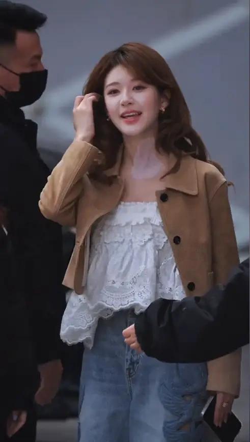 赵露思够漂亮够瘦了了吧,但是这种短款娃娃衫配阔腿牛仔裤的造型让她看起来像是怀了。
