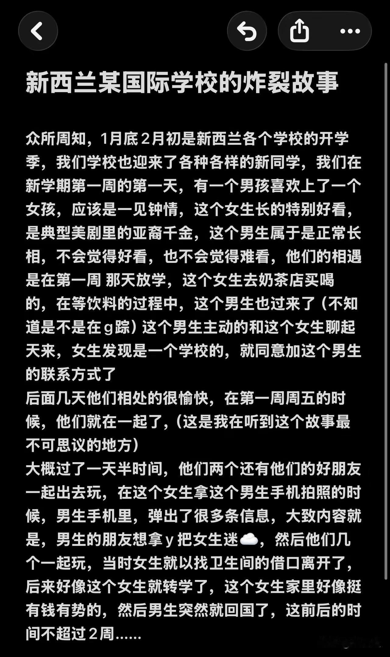 网友分享了新西兰国际学校的事情。男生看上了一位长得非常漂亮的女生,就在买奶茶的间隙向女生要到了联系方式,并且两个人聊得热火朝天,认识几天就在一起了。后来两个人出去游玩,女生拿男生手机拍照,男生手机中跳出很多短信,大概意思就是拿药把女生迷晕,几个男生一起玩。看到这样的事,故事完全不可思议,两个人发展得实在太快了,怎么有如此的神速,不到一个星期,两个人就在一起,这个男生的手段确实厉害,当然这个男生心地不善,并且想做出非常下作的事情,所以牢 A 的言论的含金量越来越高了。出国留学的女学生,即使内心并不想变坏,但是在国外的那种氛围下,好人都容易受到影响或者被伤害。而且被伤害却无地申冤。所以一般出国留学一定要慎重。