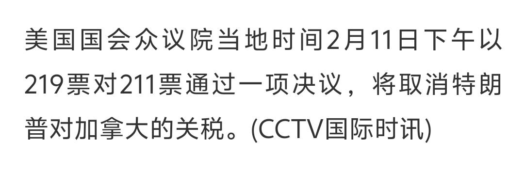 就在刚刚,特朗普关税政策遭遇重挫!2025年以来首次! 据CCTV国际时讯消息,当地时间2月11日下午,美国国会众议院以219票对211票通过一项决议,将取消特朗普对加拿大的关税。 这是2025年特朗普发动关税战以来,美国众议院首次通过否决特朗普关税政策的决议。 尽管该决议只是将取消特朗普对加拿大的关税,但极具榜样的意义:该决议之所以得到通过,是因为6名共和党议员倒戈! 这说明,特朗普的关税政策,连共和党内部也有反对声音,并已经付诸行动。