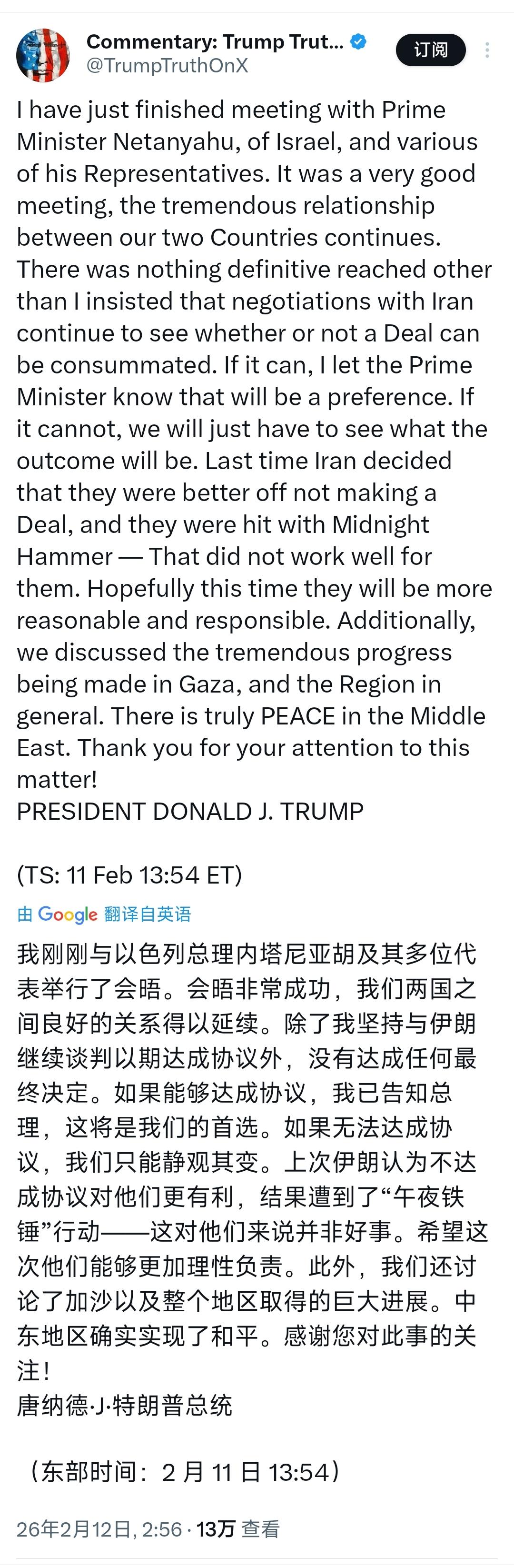 与以色列总理内塔尼亚胡结束会谈后,特朗普今天(北京时间2月12日)发文写道:“我刚刚与以色列总理内塔尼亚胡及其多位代表举行了会晤。会晤非常成功,我们两国之间良好的关系得以延续。除了我坚持与伊朗继续谈判以期达成协议外,没有达成任何最终决定。如果能够达成协议,我已告知总理,这将是我们的首选。如果无法达成协议,我们只能静观其变。上次伊朗认为不达成协议对他们更有利,结果遭到了‘午夜铁锤’行动这对他们来说并非好事。希望这次他们能够更加理性负责。此外,我们还讨论了加沙以及整个地区取得的巨大进展。中东地区确实实现了和平。” [机智]评几句:特朗普与内塔尼亚胡闭门长谈三小时、会后拒不出面联合见记者,本就反常蹊跷,随即发文宣称未就对伊措施做最终决定、要给谈判一次机会,这番表态更像刻意放烟幕。内塔尼亚胡远道而来,目标是彻底铲除伊朗核与导弹项目、推动政权更迭,绝非空谈;伊朗只求小修小补过关,双方诉求天差地别。更值得警惕的是,林肯号航母已就位,布什号战斗群接到赴中东指令,美军双航母战斗群即将完成战位部署,军力集结到位后的谈判,不过是掩人耳目的缓兵之计。特朗普一边释放谈判善意,一边完成军事围堵,嘴上说静观其变,实则手握动武按钮,所谓“首选协议”只是说辞,一旦时机成熟,不排除突然对伊朗发起军事行动,这场戏码从头到尾都是强权威慑与政治算计。