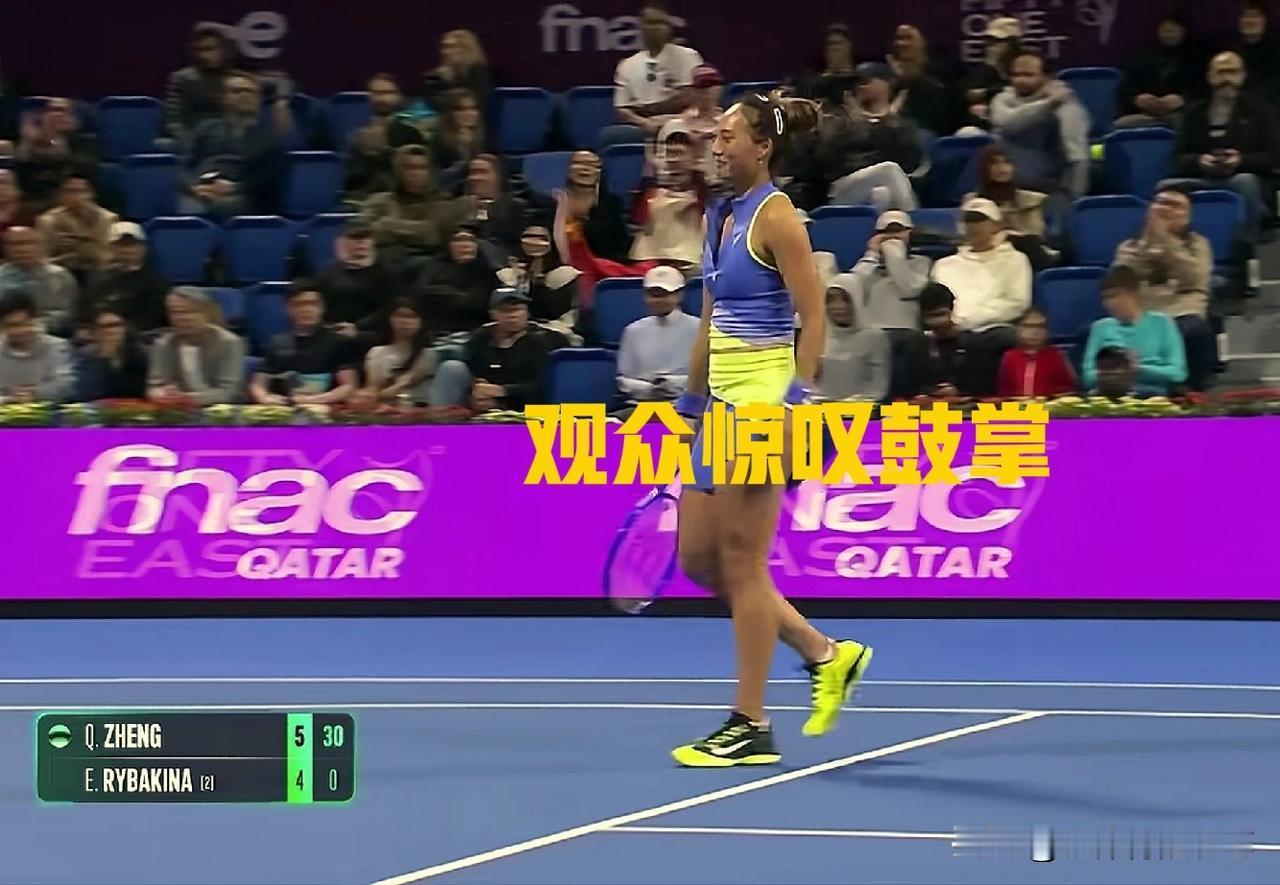 这一球,观众爆出“哇哇”的惊叹声[赞],首盘与莱巴金娜的发球胜盘局,郑钦文发出一记大角度的外角好球,对手却顽强地救回,这发球,这防守能力都很强啊。接着她迅速抽球到对手右边空档,看似不能救活的球,又被莱巴金娜神奇般地挡回,郑钦文得分后,摇摇头,绷不住也笑了,这一来回球,展现了两人极佳的攻防水平,真不愧当今女网顶尖高手。好看,真好看,向最终晋级的莱巴金娜祝贺,也为拼尽全力的郑钦文加油鼓掌[击掌]一句话形容郑钦文