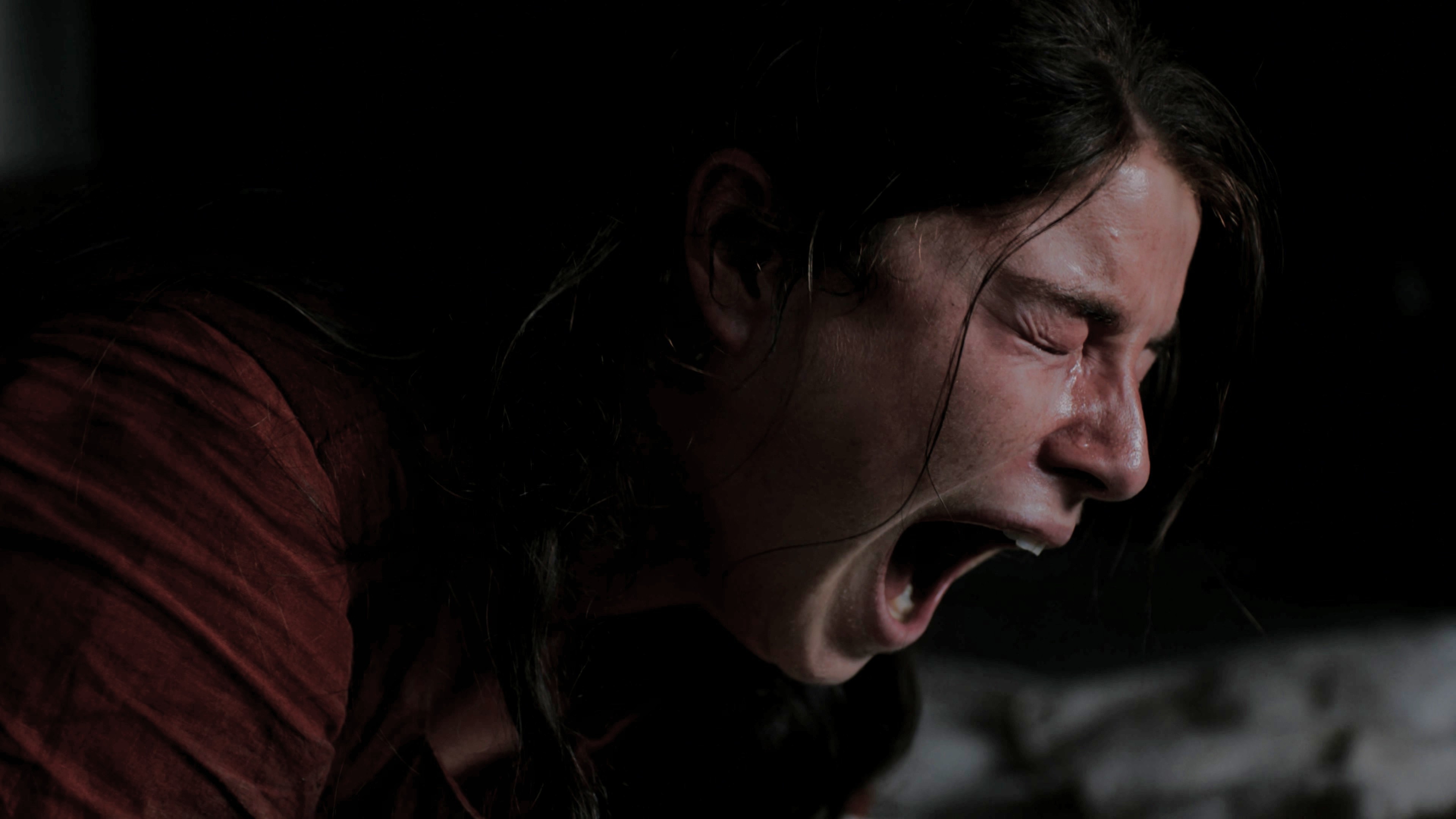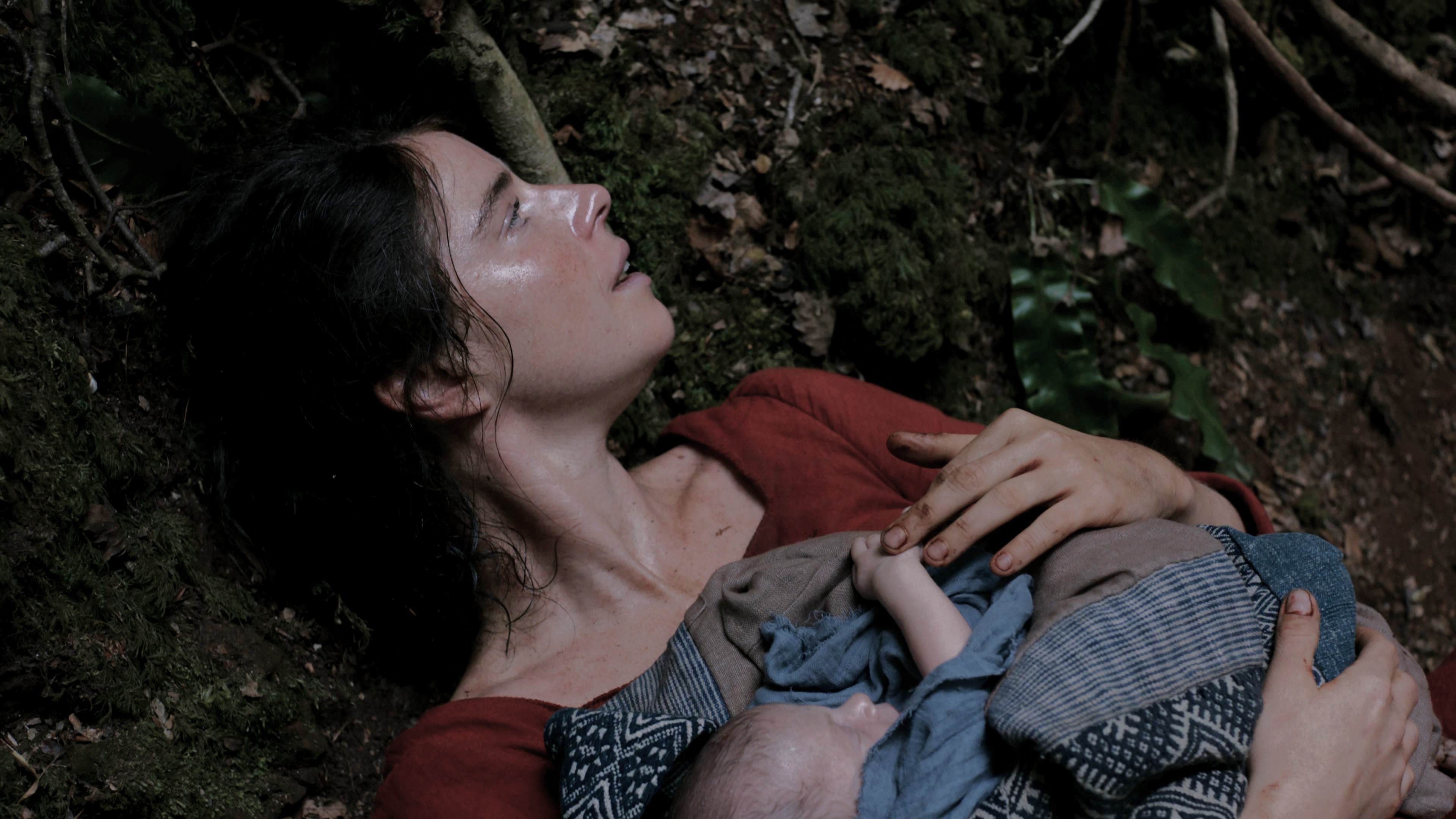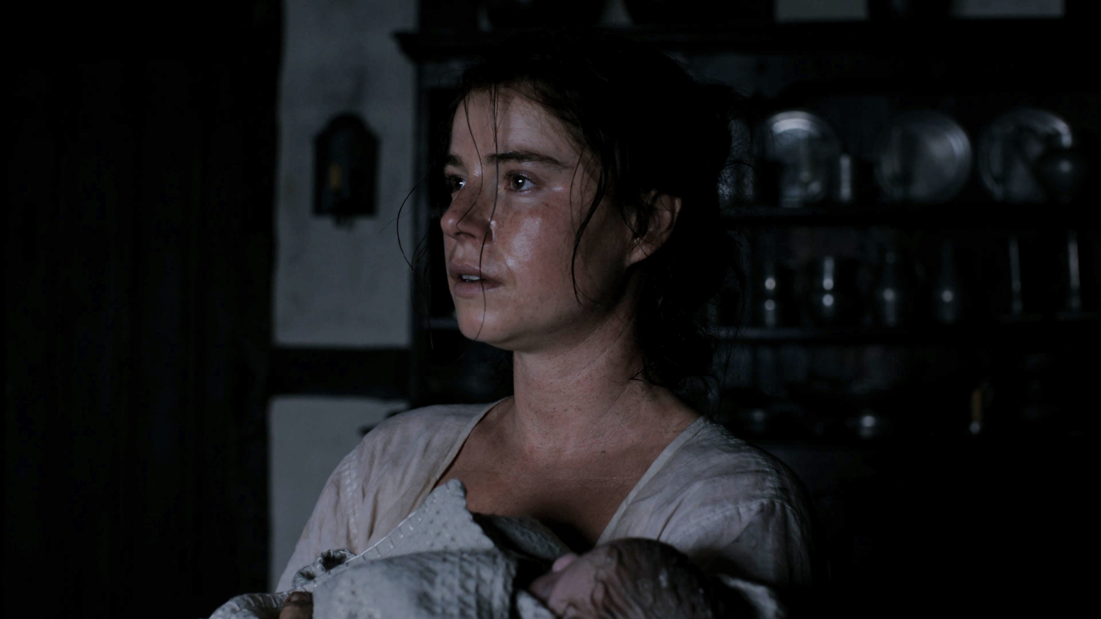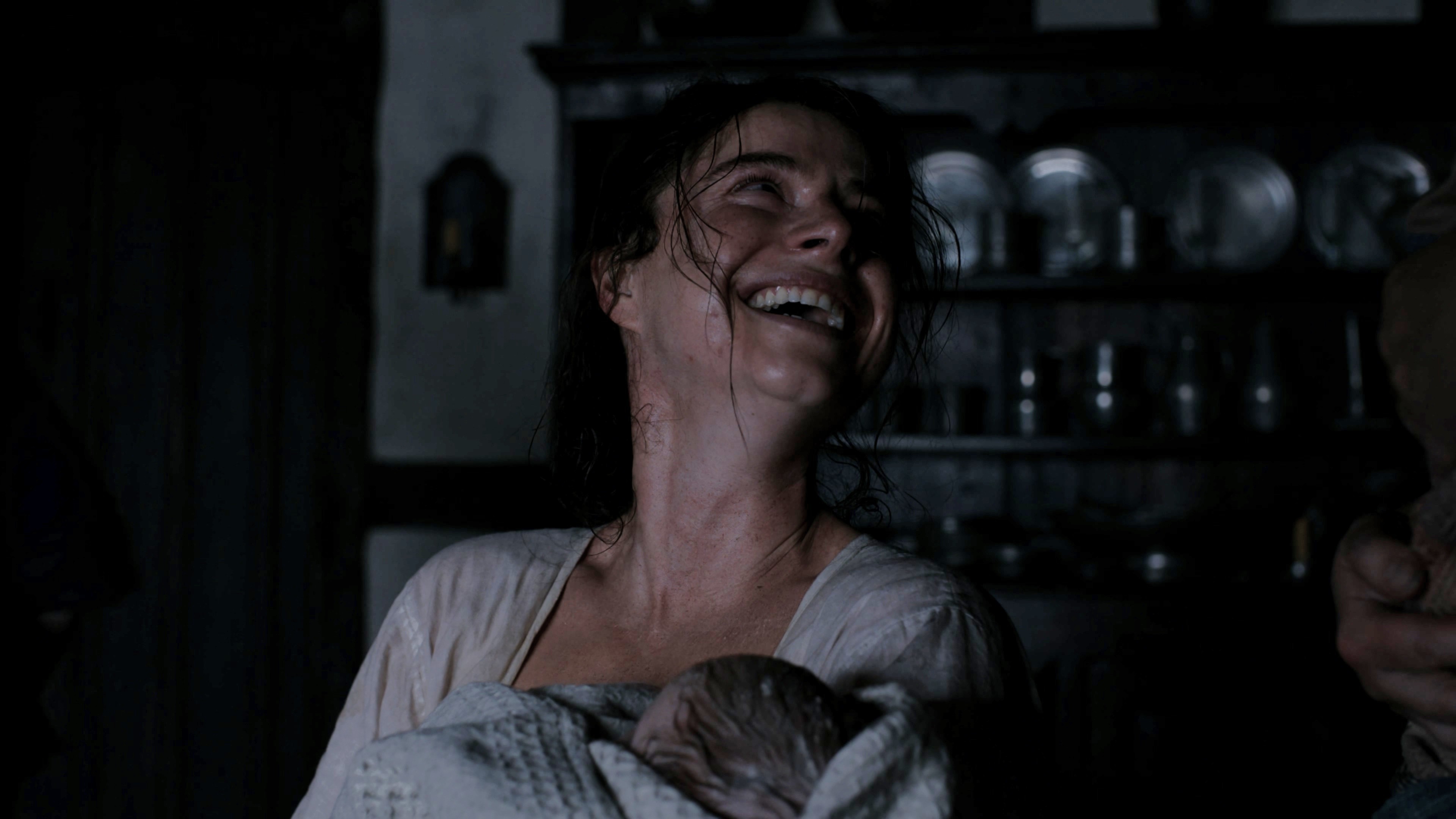 男主曾长期受困于自己父亲的暴虐管束,对家庭环境和琐事感到窒息,于是前往伦敦专心写作,独留妻子在家中产下第二个孩子(哈姆奈特的妹妹)。这场生育戏是杰西·巴克利的第一个演技爆发的段落(如图3、图4)。接生婆和女佣强留她在家生产,她渴望重新回到林中,害怕这所阴暗老旧的房子,但几经挣扎后逃离失败。好不容易生下孩子,却久久听不到哭声,自己也虚弱到不行。在惊惧、虚脱和濒死感一起袭来之时,女主眼前浮现出童年时母亲离世而自己被佣人拉住(未能好好告别)的情景,霎时崩溃到拥住接生婆痛哭失声。等她终于被允许抱起孩子,似乎已能稍微平静地接受孩子夭折的现实时,婴儿的哭声姗姗来迟,阿格尼丝终于破涕为笑,激动万分。