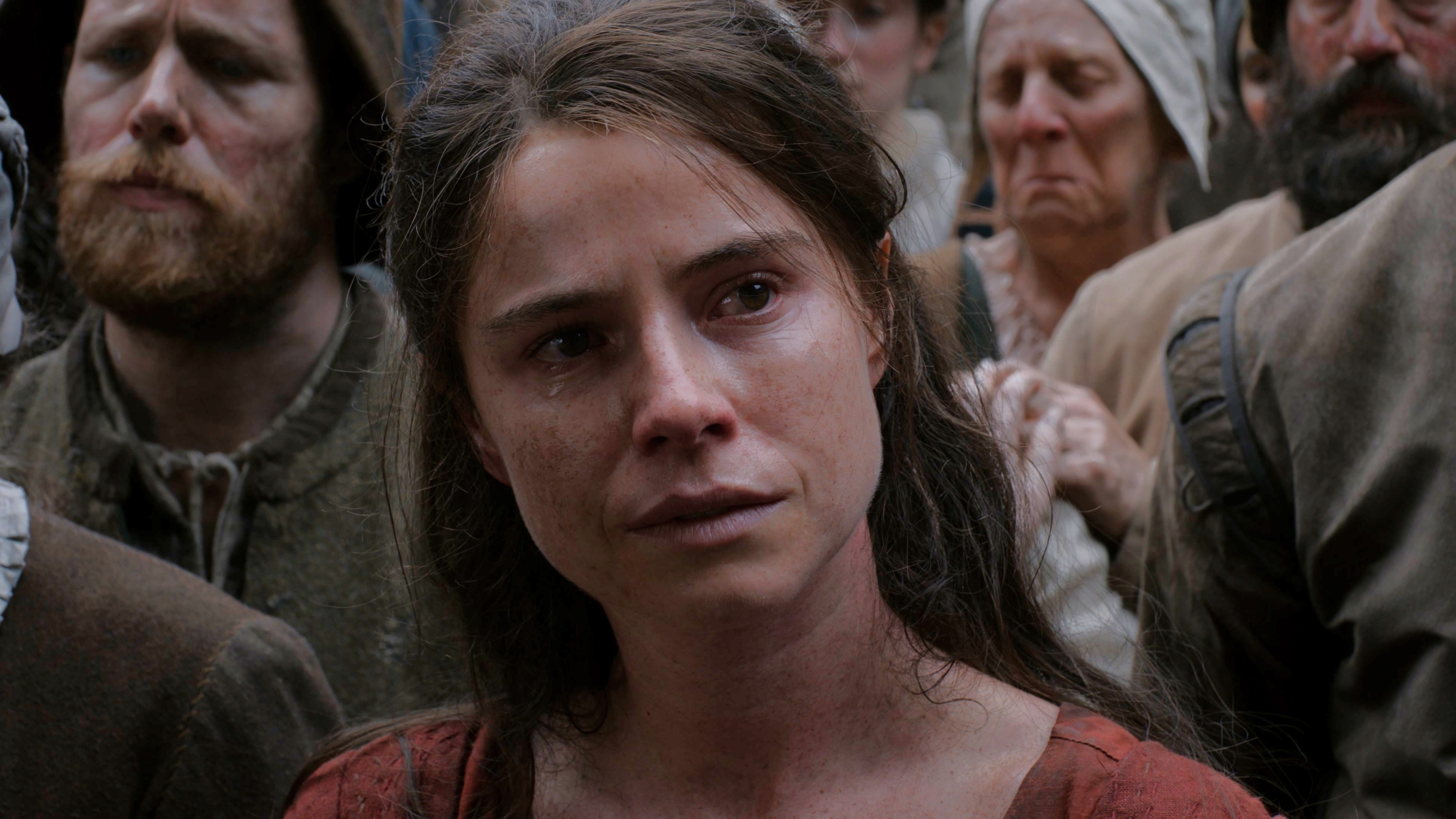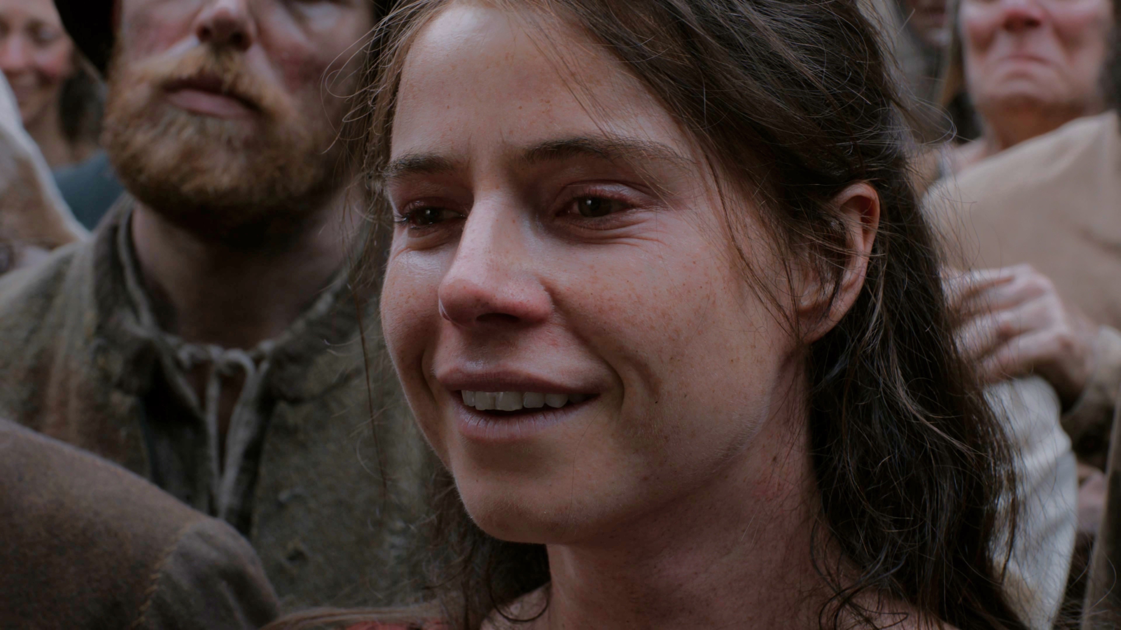 女主的第二段精彩表演是在已长成小男孩的哈姆奈特染疫死去(前面有一段哥哥为拯救病重的妹妹互换位置意图骗过死神的铺垫)时,依然是丈夫远在伦敦无法及时赶回的情况。此前她已使出浑身解数挽救儿子,待到孩子断气之时,阿格尼丝先是神情凝滞,短暂呆住,接着爆发出撕心裂肺的哀嚎,随后进入一种喃喃自语又不时哽咽的悲痛状态。说实话,每个人面对亲友离世或陷入巨大悲伤时的表现各不相同,比如有的人可能很长时间都表面平静波澜不惊,还有些人哭泣但不怎么出声,而杰西·巴克利在此的表演虽然相当“外放”,却毫无违和感,我们完全能共感到一个拼尽全力仍只能眼睁睁看着死神带走孩子的母亲所遭遇的无比痛切与破碎。