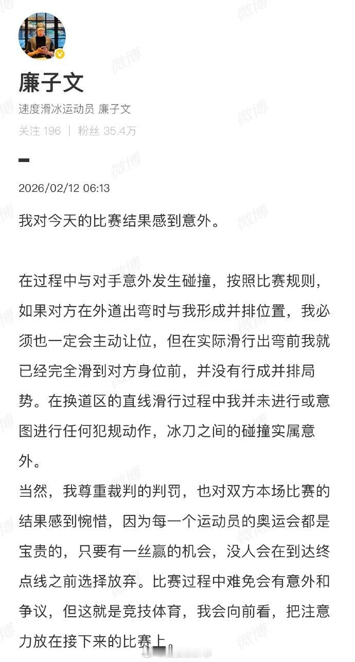 在过程中与对手意外发生碰撞,按照比赛规则,如果对方在外道出弯时与我形成并排位置,我必须也一定会主动让位,但在实际滑行出弯前我就已经完全滑到对方身位前,并没有行成并排局势。在换道区的直线滑行过程中我并未进行或意图进行任何犯规动作,冰刀之间的碰撞实属意外。当然,我尊重裁判的判罚,也对双方本场比赛的结果感到惋惜,因为每一个运动员的奥运会都是宝贵的,只要有一丝赢的机会,没人会在到达终点线之前选择放弃。比赛过程中难免会有意外和争议,但这就是竞技体育,我会向前看,把注意力放在接下来的比赛上。廉子文被取消成绩