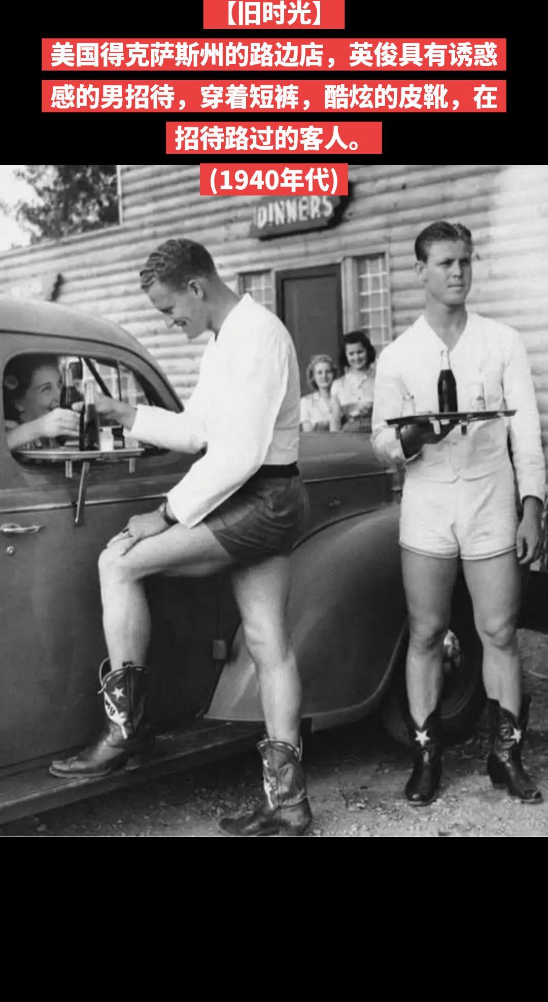 【旧时光】美国得克萨斯州的路边店,英俊具有诱惑感的男招待,穿着短裤,酷炫的皮靴,在招待路过的客人。 (1940年代)