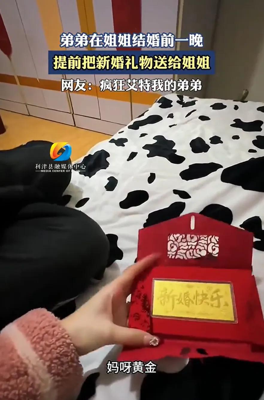 安徽,女子第二天就要结婚了,可前一天晚上弟弟却突然敲门进来说有点事,姐姐不明白,大半夜的不睡觉,有什么事不能第二天早上再说,谁知弟弟却突然从兜里拿出一个红包,打开一看里面竟然是一块黄金。网友:疯狂艾特我的弟弟 那是一个反直觉的物理瞬间:当你的手指捏住一个红包,预判的是纸张的轻薄,掌心传来的却是金属特有的坠手感。 这一幕发生在安徽。时间被精确锁定在大婚前夜的最后几个小时,也就是大多数人认为最应该睡觉、却最睡不着的“垃圾时间”。 新娘刚刚合上离家的行李箱,疲惫感像潮水一样没过头顶。这时候响起的敲门声,不仅仅是噪音,更像是一种对生物钟的冒犯。 门开了,站在那里的是弟弟。 按照常理,明天就是正日,全家上下几百个流程等着走,这时候跑来敲门,大概率是又忘了哪个琐碎的环节,或者纯粹是没事找事的瞎折腾。 姐姐满脸疑惑,甚至可能带着点起床气。毕竟在安徽老家的习俗里,明天这个时候,她已经是另一个家庭的一员了。 弟弟没接话,脸上的表情混合了那种特有的、想装作不在意却又藏不住紧张的神色。他避开了眼神交流,直接走向床边。 他从兜里掏出一个红包。动作很快,像是急于完成某种交接仪式,把东西往床上一放,甚至没敢直接递到姐姐手里。 “给你准备了点东西,想来想去,还是今晚给最合适。” 这句话没头没尾,却把所有的潜台词都堵在了嗓子眼。 姐姐拿起那个红包,眉头瞬间锁紧了。不对劲,这重量完全违反了红包的物理定律。 这绝对不是钱,至少不是纸做的钱。 带着一种拆解未知的忐忑,她打开了封口。一抹刺眼的金黄色直接撞进视线——不是薄薄的金箔,而是一块实打实的金条。 更让人呼吸一滞的,是黄金表面那并非出厂自带的纹路。 上面用激光蚀刻着四个字:“新婚快乐”。 这四个字带来的冲击力,远比黄金本身的克重更猛烈。 如果是去金店随手买一块,那叫资产转移。但把字刻上去,意味着这是一场蓄谋已久的策划。 因为刻了字,这块黄金就失去了在二级市场原本的流通性,它被强制锁定为一块只能属于姐姐的私有纪念碑。 这一刻,姐姐才突然读懂了那个“今晚最合适”的时间差策略。 明天,婚礼现场会有震耳欲聋的鞭炮,有司仪煽情的套话,有七大姑八大姨的喧嚣。在那个名利场一般的舞台上,情感是被表演出来的。 而此时此刻,在这寂静的深夜,在这个只有血缘关系在场的几平米空间里,情感才是原始且纯粹的。 弟弟显然是个极简主义的执行者。 看着姐姐愣在原地,他没有趁热打铁来一段感人肺腑的演讲,仅仅扔下一句“早点休息”,就转身执行了撤离程序。 那个背影走得如此干脆,仿佛刚才只是进来借了个指甲刀。 但这种“失语”,恰恰是东方家庭里男性表达亲密关系的最高级形式。 姐姐看着手里的金子,眼眶瞬间就红了。这块金属此刻承载的,不再是当天的金价指数,而是姐弟俩二十多年来在这个屋檐下共同呼吸过的岁月。 当这段视频被上传到网络后,评论区瞬间变成了一个巨大的“相对剥夺感”实验现场。 无数网友盯着屏幕,再转头看看自家那个只会抢零食、在沙发上葛优躺的亲弟弟,心理防线全面崩塌。 有人疯狂艾特自己的怨种兄弟,质问为什么大家基因相似度高达99%,做人的差距却能拉开一个银河系。 其实,大家羡慕的不仅是那一块黄金。 在这个充满不确定性的世界里,黄金代表着最后的硬通货,意味着弟弟在用真金白银告诉姐姐:“无论你嫁去哪里,只要回头,这里永远有你的底气。” 相比于红包里的纸币会被花掉、会被通胀稀释,这块刻字的黄金是一份永续的契约。 它像一个沉甸甸的压舱石,被弟弟亲手塞进了姐姐即将远航的行囊里。 那一夜,安徽的月光或许很凉,但这块金属的温度,足以熨平离别前所有的不安。
