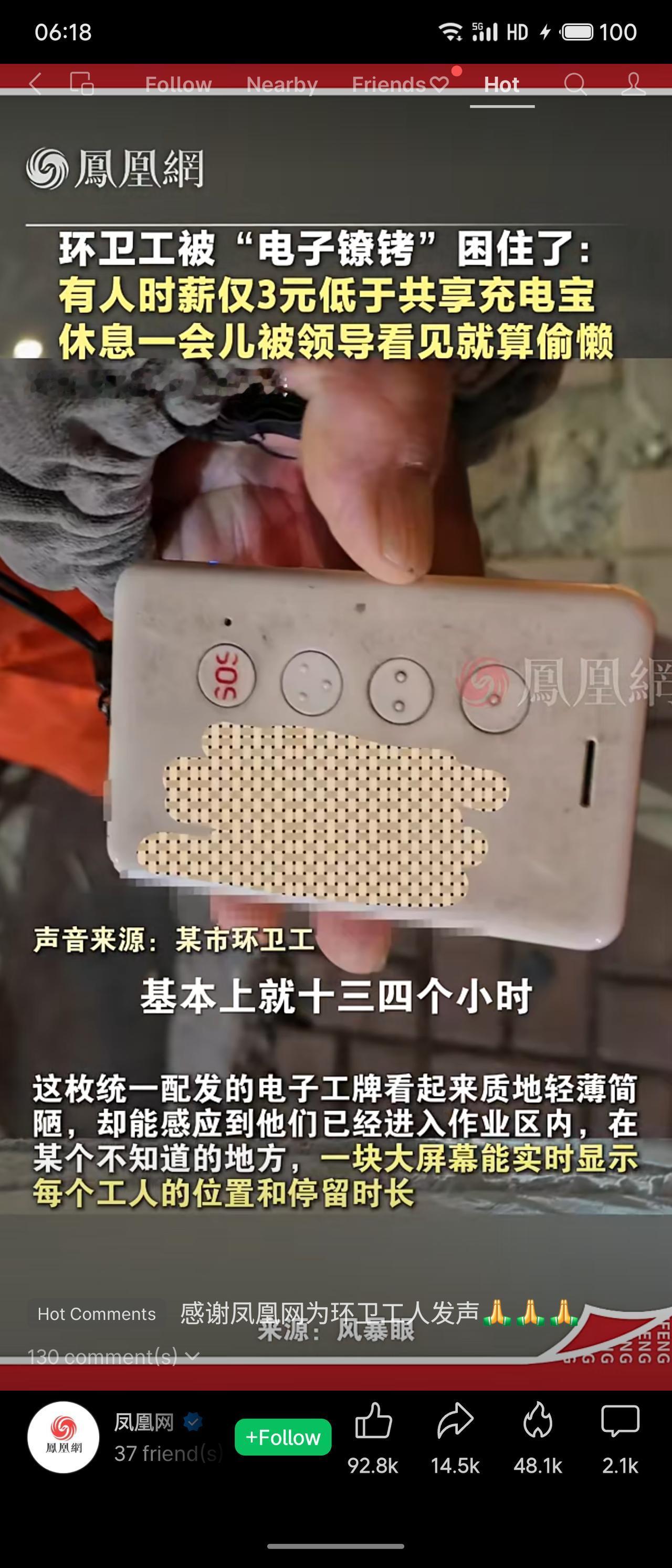 报道揭露了多地环卫工被电子工牌、智能手环等技术手段严苛监控的现象。有人时薪仅3元,甚至低于共享充电宝;工作长达13-14小时,停留超20分钟即被警告“偷懒”。技术本应服务人,却异化为压迫底层劳动者的“电子镣铐”。这不仅暴露了环卫系统管理的冷漠与不公,更折射出劳动者尊严在效率至上前被漠视的现实。凤凰网的报道为无声者发声,值得关注与反思。