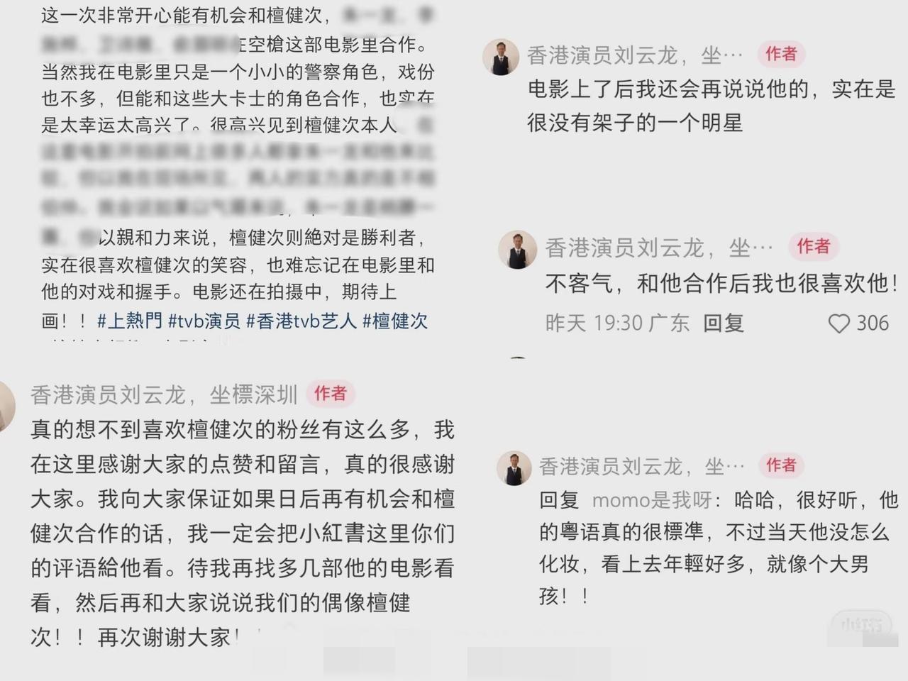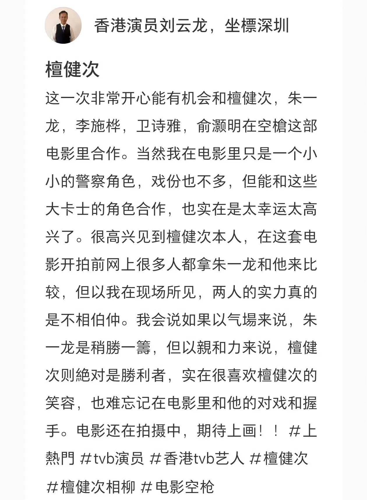 看到这个客串《空枪》香港演员对檀健次的欣赏,由衷觉得香港的老派艺人还是很耿直的!中国文字博大精深,稍胜,绝对强者, 檀健次的气场从不用在不合时宜的场合,他的气场都诠释在角色中,除了拍戏,私下都是很亲和的,这才是一个好的艺人! 亲和力满分、笑容迷人、没架子、粤语很标准、不化妆嫩得像大男孩!檀健次素颜真的很显小,我们那天还说他上妆是为了显得成熟一些! 我一直认为檀健次的实力是很有侵略性的, 其实大哥冷脸的时候气场也2米8,只是他一般爱对人笑,不爱冷脸对人~ 檀健次五官精致,长相大气。他只是把气场用在该用的地方而已。了解他的人都知道他是个很有礼貌的人,性格柔和。合作过的只要是正常人就没有不喜欢他的。 很多合作过的人都夸他没那么大的明星架子,他其实对谁都很热情,很有亲和力,看到他的笑就像看到个老朋友,给人感觉很舒服很踏实的朋友一样。 这个前辈是香港的实力派老戏骨了, 檀健次能得到他们的赞赏,绝对是德艺双馨的! 但是可悲的是这个前辈的帖子已经被删除了,严重怀疑被威胁或者被举报下架了,懂得都懂,那家太可怕了,真是给正主招黑! 对于《空枪》这部电影我真的五味杂陈的,真的是因为檀健次才关注的这部电影,但是提起它就是如鲠在喉,要说期待值,我最期待的是檀老师的粤语! 有专业人士翻译了一下檀健次上次星光大赏直播时的粤语,他的粤语真的进步好多,能听出练了语调和一些尾音的痕迹。认真听和以前是不一样的,更自然了一些,因为加了一些尾音丝滑了好多,有在悄悄努力哦! 檀健次:大家好啊!吃了没?看电影?有啊!疯…动物城,都看过了,还有什么呢…我好喜欢看电影的。 还要讲什么,还想听什么?我现在粤语好厉害的!好厉害!翻译呀,想翻译呀,没问题,我讲粤语行不行(求表扬的意思),我讲粤语都是小意思啦,喜不喜欢我讲粤语啊? 听又听不明,讲又讲…算了我也不会了(看香港咨询梗看多了哦),喜欢我啊!哇,多谢哦,多谢你喜欢我!吃了肠粉没?吃了啊,我吃了肠粉,好好吃! 看到很多人说他是广西人本来就会说白话,我觉得不对,这完全弱化健次在学习粤语上所做的各种努力。 其实白话和粤语的区别很大,说粤语会有非常强的口音我们外行的听不出来但粤语区一听就能听出来,健次能说粤语并且说的很溜,是语言天赋+努力练习的结果和手语一样离不开他日以继日的付出! 广东粤语和广西白话确实是会有一些口音上的不同,很正常,其实想想不同村都有不同的口音,何况是两个省! 所以要对檀老师有充分信心,而且绝不可否认的是看了檀老师这么多的作品,深知檀老师作为一名努力且专业的演员,一定是有能力有恒心会把角色诠释到最好的!到时候大家电影院见分晓,见证檀老师的新角色啦!期待期待!