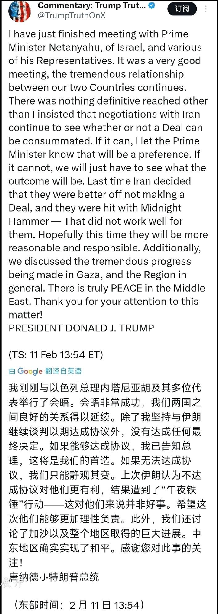 2月12日,美国总统特朗普与以色列总理内塔尼亚胡,闭门三小时会谈且会后拒绝出席记者会,只发文:“我刚刚与以色列总理内塔尼亚胡及其多位代表举行了会晤,非常成功。 我们两国之间良好的关系得以延续,除了我坚持与伊朗继续谈判,与其达成协议外,没有达成任何最终决定。如果能够达成协议,我已告知总理,这将是我们的首选,如果无法达成协议,我们只能静观其变。上次伊朗认为不达成协议,对他们更有利,结果遭到了午夜铁锤行动,这对他们来说并非好事。希望这次他们能够更加理性负责。此外,我们还讨论了加沙以及整个地区取得的巨大进展。中东地区确实实现了和平。” 个人认为:文章本身充满了谎言与不实,不值一看。但是一定要看“发文章”这回事,因为此招起到的是欺骗,是误导,是释放所谓和平的烟雾弹,是拖延之计。因为美国和以色列,还没有协调妥当与海湾国家的利益分配,所以只好出此下策。 因为只有利益分配妥当,美国就会毫不犹豫的侵略伊朗。
