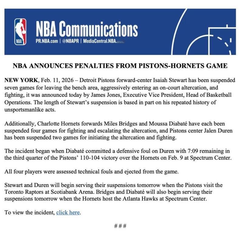 什么鬼?肇事者杜伦罚的是不是太轻了? NBA官方:斯图尔特禁赛7场,布里奇斯迪亚