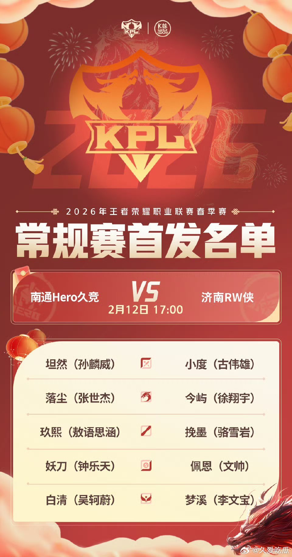 2026KPL春季赛今日首发名单