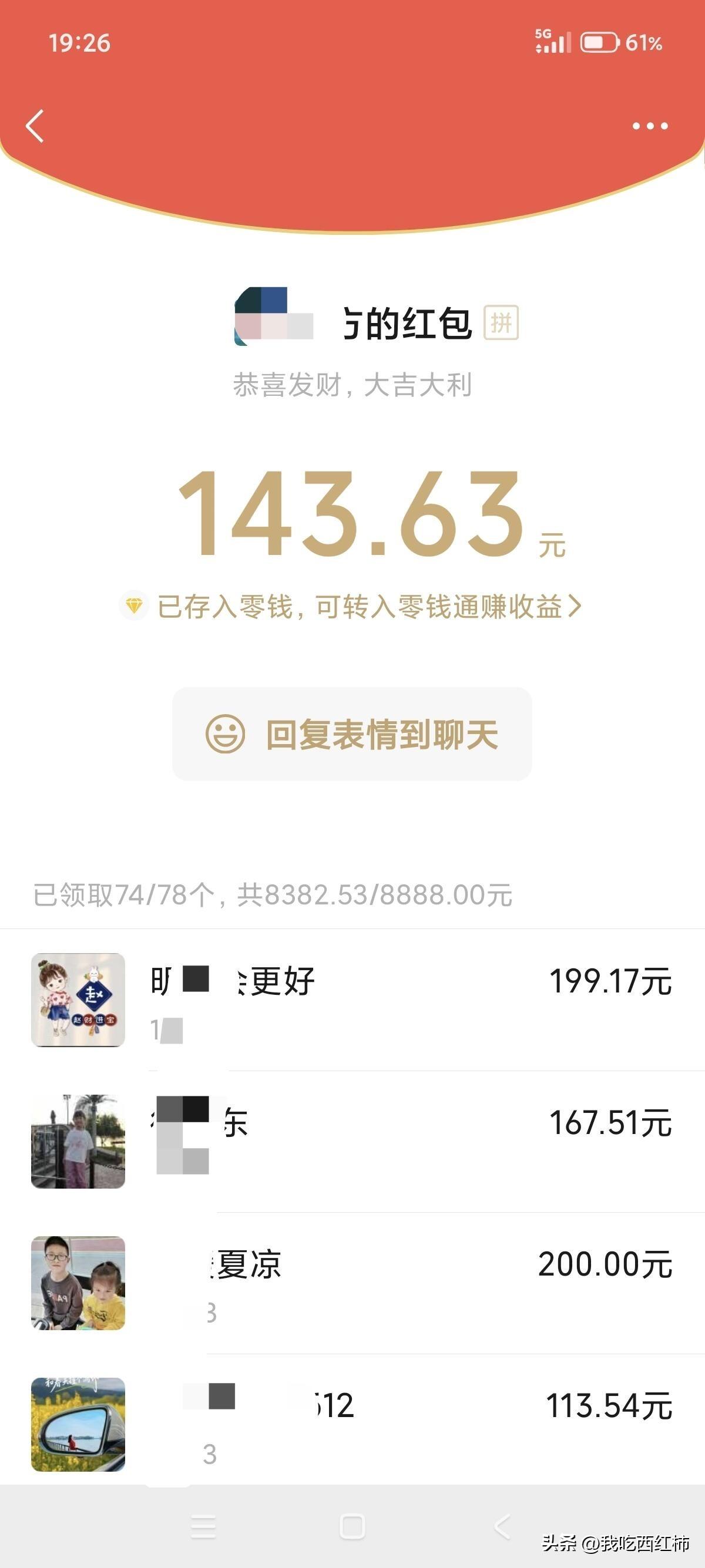 我太难了!老板让我喝酒才给大家发红包! 关键是用我号发!他说他微信里没钱!明天给我报销! 一个个要红包还得我先喝一杯!我这活干的怎么就这么难呢! 最后管他的,发了一个9999,一个8888的,本来还要发个2888的,结果银行卡当日限额发不了。只发了666收个尾了 多的人一晚上估计抢了千把块红包,我自己就抢到七八百,一晚上估计总共发了五六万红包 13:51时报销已顺利到账! 还有800来块红包没领,退回的话就当我喝酒的辛苦费了 没领的红包刚7点左右都退回来了,共800.53元!就是我那一口酒的辛苦费了