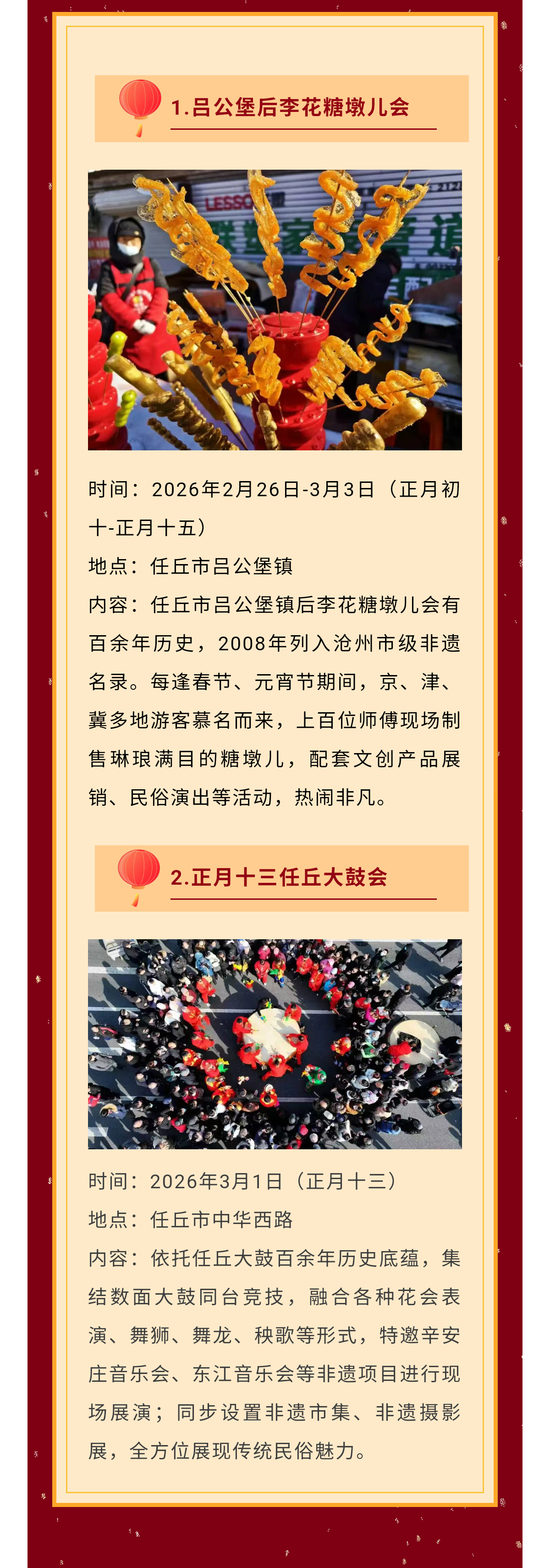 内容:依托任丘大鼓百余年历史底蕴,集结数面大鼓同台竞技,融合各种花会表演、舞狮、舞龙、秧歌等形式,特邀辛安庄音乐会、东江音乐会等非遗项目进行现场展演;同步设置非遗市集、非遗摄影展,全方位展现传统民俗魅力。