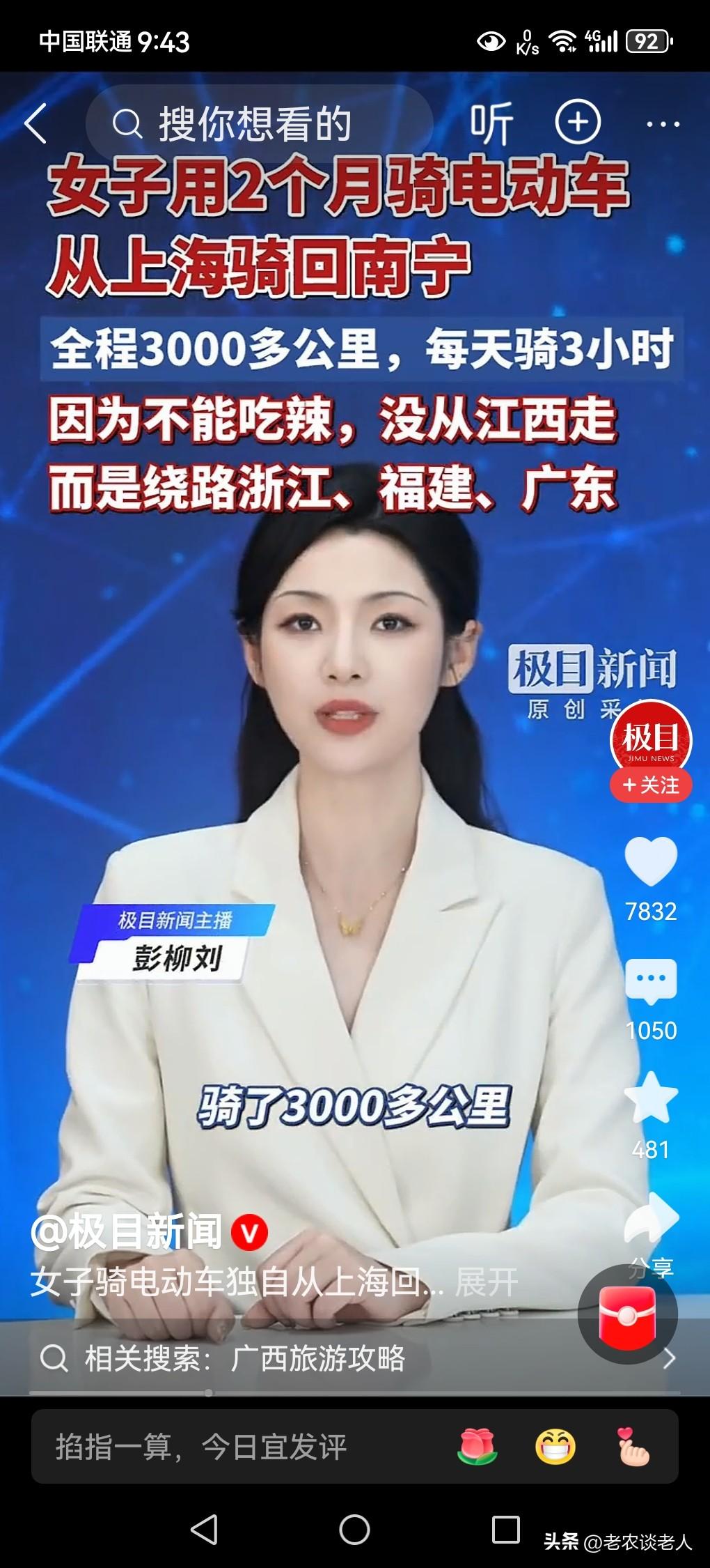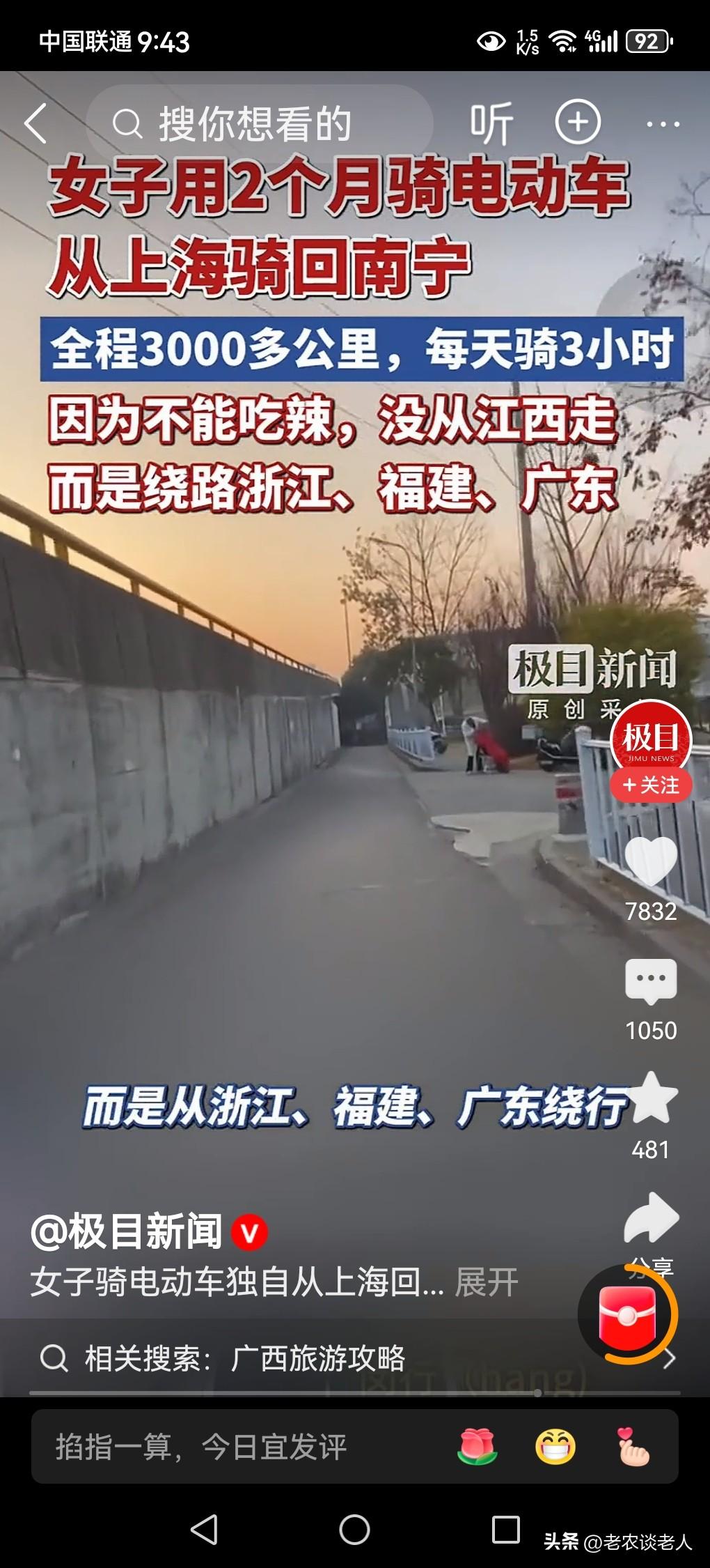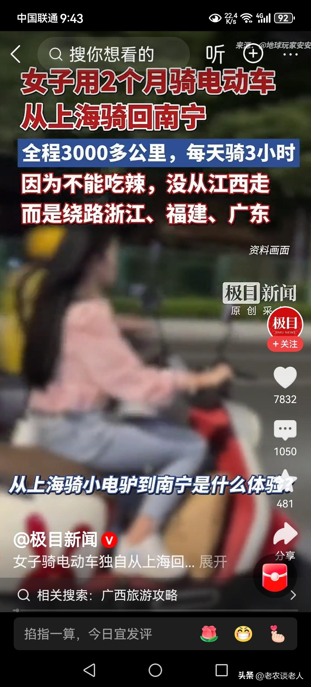 女子骑电动车近2月从上海回广西老家过年! 电动车俗称“小电驴子”,是一种短途便利的交通工具,充一次电也只能跑100里左右的路程,适合上班下班,买菜购物,走亲串友之用,不适合跑长途。 据媒体2月12日报道,远在上海工作30岁的安安,于12月份辞职,骑电动车回家过年。因为他不吃辣的,只好绕开江西,途径浙江、福建,广东,再回广西南宁老家,她每次只能骑行3个小时就要充电,每天充电三次,骑行了大约两个月,行程3000公里才赶回家。 透过此新闻故事,回到我们的现实生活中来,本人认为,①骑小电驴子也能作为长途交通工具的一种选择,只是在骑行的过程中。需要频繁的充电,骑行的速度也不是那么快,是电动车绕不开的“死结结”。 ②骑小电驴子长途跋涉,必须要有毅力,要有决心,要有干劲,否则是承受不了的,是完成不了长途旅行的。 ③长时间骑行电动车,长途跋涉必须要有强硬的身体健康作为基础,作为支撑,身体健康不佳的人,建议千万不要尝试这种做法,避免不必要的不测事情在途中发生。 以上是本人观点,如有不妥,请大家在留言区中留下你宝贵的意见,并积极参与评论。
