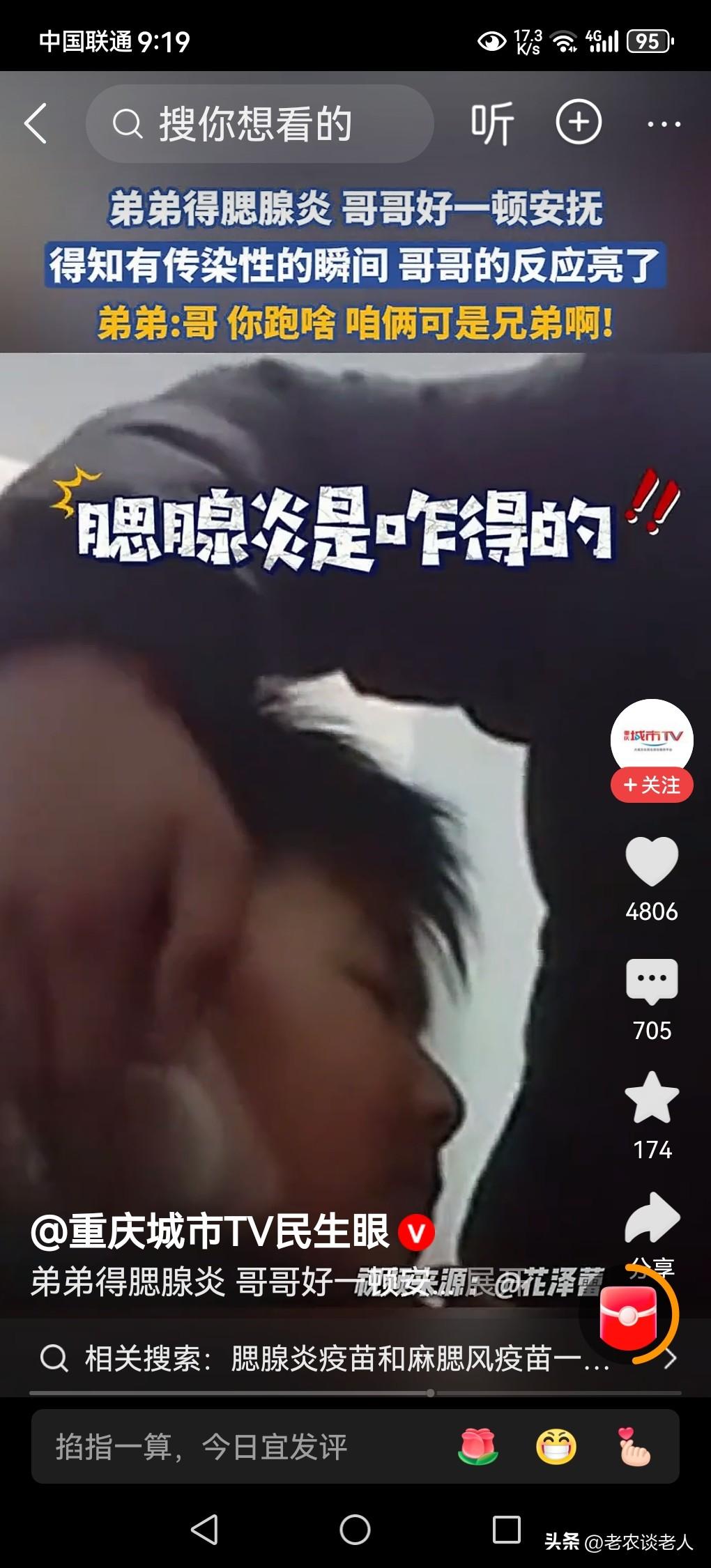 弟弟得腮腺炎,哥哥得知传染后秒变脸。 腮腺炎是青少年一种常见的疾病,它的传染性非常强,一旦患者与非患者接触,马上就把这种病害传染给非患者。 因此换了腮腺炎的小孩子,一定要与其他的孩子保持相应的距离,避免感染上了这种病害。每一个小孩子一定要做好自我保护能力,保护好自己的身体健康是最重要的事情。 据媒体2月12日报道,一个弟弟患上了腮腺炎,唤哥哥过来看一看,哥哥就询问弟弟是怎么患上了腮腺炎的。弟弟告诉他,这是人家传染给他的,没想到哥哥反应非常强,意识到该病传染性强,立马变脸,跑得比兔子还快。 从这一个小故事来看,培养青少年自我保护能力是非常重要的事情。这位哥哥,虽然了解到弟弟患病的原因以后,有一些冷酷,麻木不仁,但毕竟他是一个小孩子,没有关心到弟弟的情感,没有安慰弟弟的话是自然的,他并没有在弟弟面前呆的时间长而感染这种病害,而是选择快速逃离的办法,保护好自己的身体健康要紧,“逃跑”是哥哥唯一的最佳的选择,是值得所有青少年应该学习的。 以上是本人观点,如有不妥,请大家在留言区处留下你宝贵的意见,并积极参与评论。 春节与智己从容出行弟弟得腮腺炎 哥哥得知传染后秒变脸