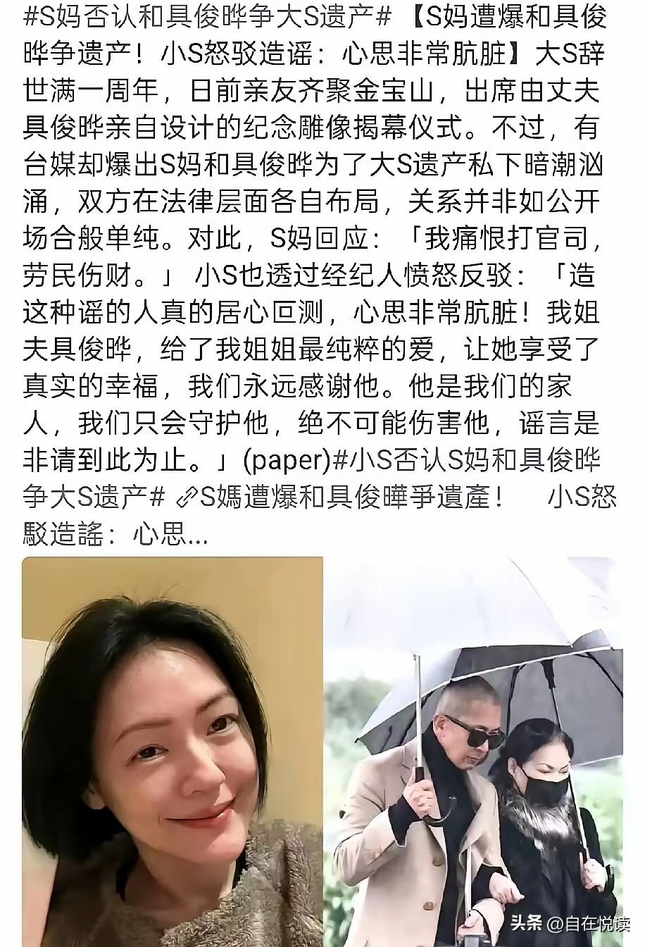 难怪 这才是完整的闭环了 一家人活着被大S养 现在又一次次拿她做流量 原来都是为了托举小的两女儿 去吧去吧 只要不来内地 去哪都是他们的自由 什么深情爱妻 什么国民姐夫 转了那么大一圈 全是为了洗白自己 可惜网络是有记忆的 时间也会给出正确的答案 德不配位必有灾yang