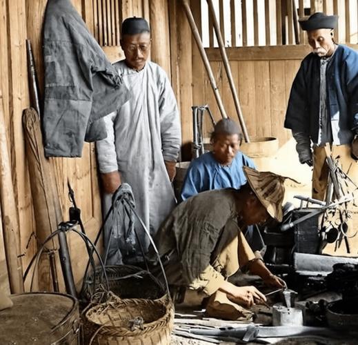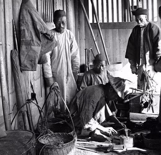 这张照片由苏格兰摄影师约翰·汤姆逊于1868-1872年间在福州拍摄,是他摄影集《福州和闽江》中的珍贵影像,记录了晚清时期中国市井生活的一个瞬间。 照片中,一位匠人正蹲在地上,专注地用工具修补器物,旁边的小火炉和各式工具表明,他很可能是一位补锅匠或锔瓷匠。在物资匮乏的年代,“新三年,旧三年,缝缝补补又三年”是生活常态,修补匠的手艺是家家户户的刚需。他们挑着担子走街串巷,用精湛的技艺让破损的铁锅、瓷碗重获新生。