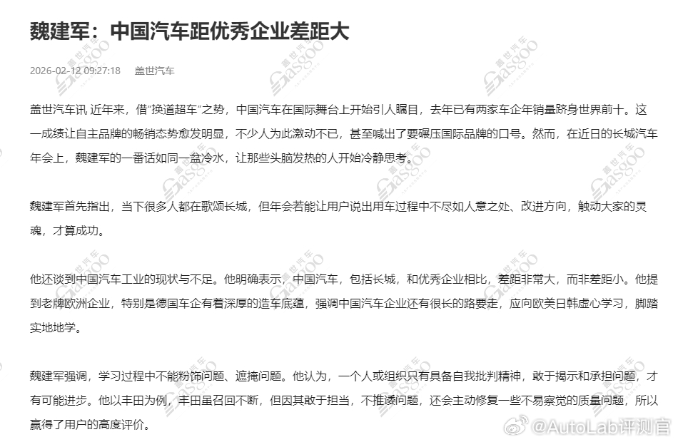 魏建军表示:中国汽车,包括长城,和优秀企业相比,差距非常大,而非差距小