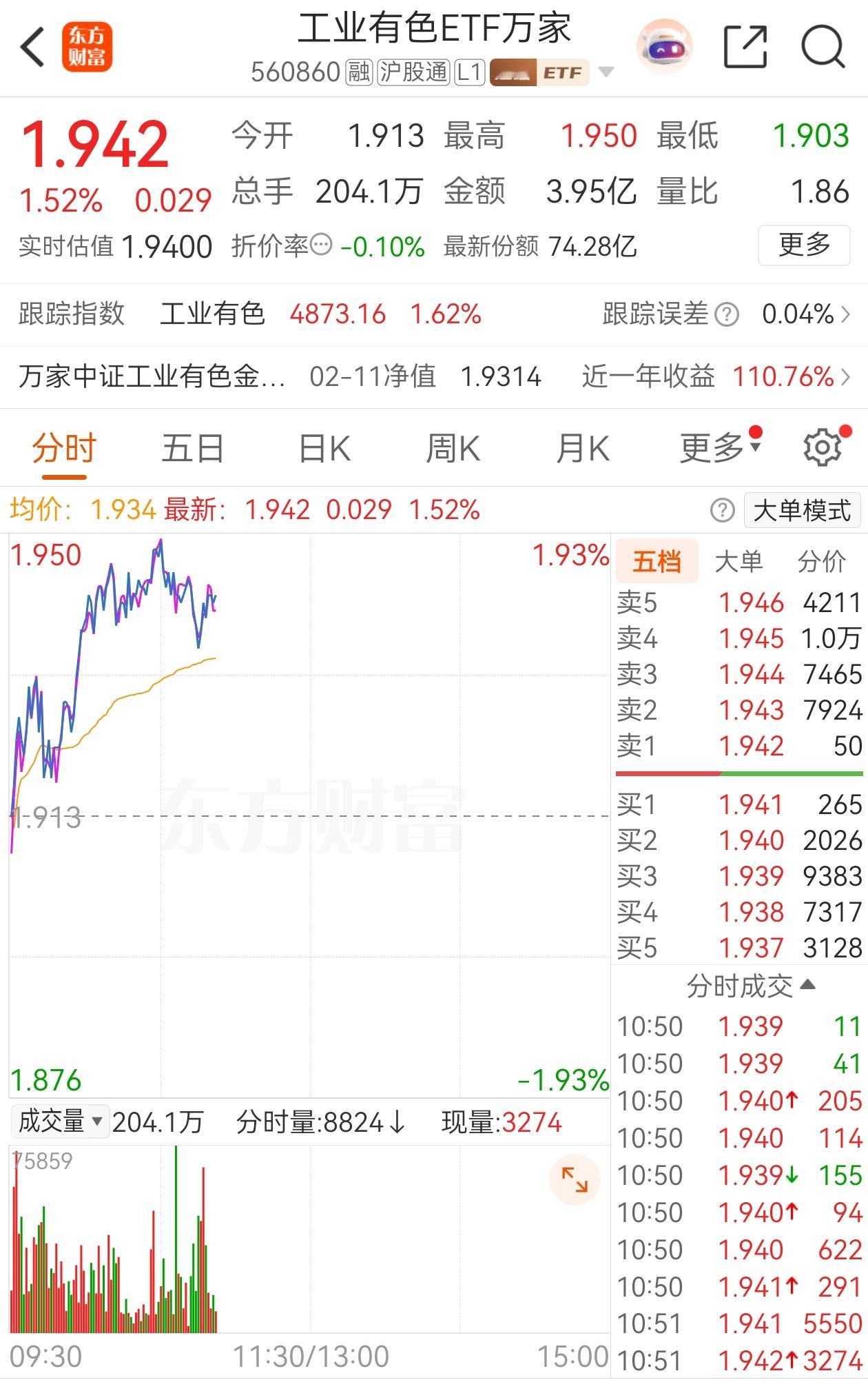 2月12日有色金属概念开盘拉升,截至10:06,工业有色ETF万家上涨1.46%