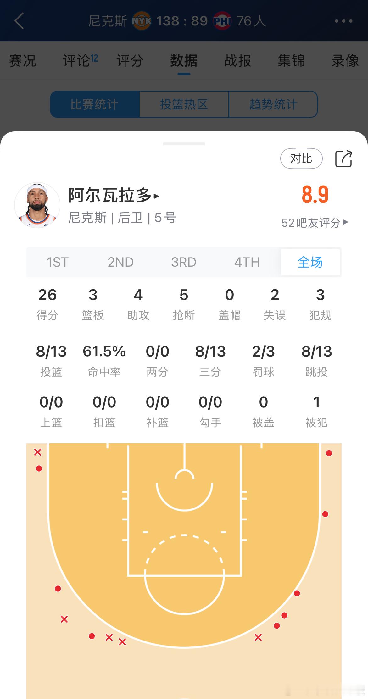 尼克斯新援阿尔瓦拉多全场投进8记三分,替补贡献26分3板4助5抢断,+35