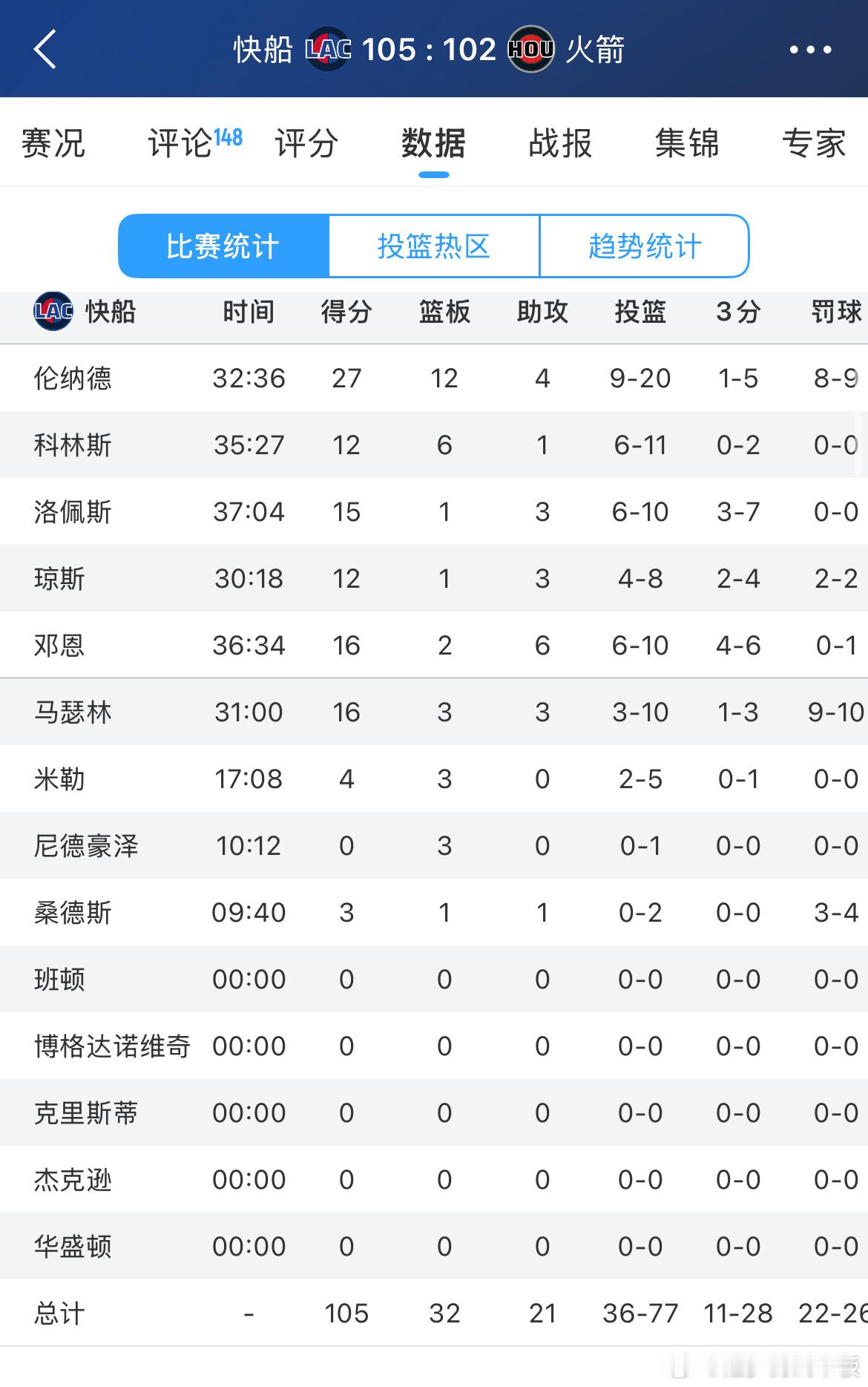 快船105-102战胜火箭!火箭和湖人差距回到1胜场伦纳德全场27分12板,第四