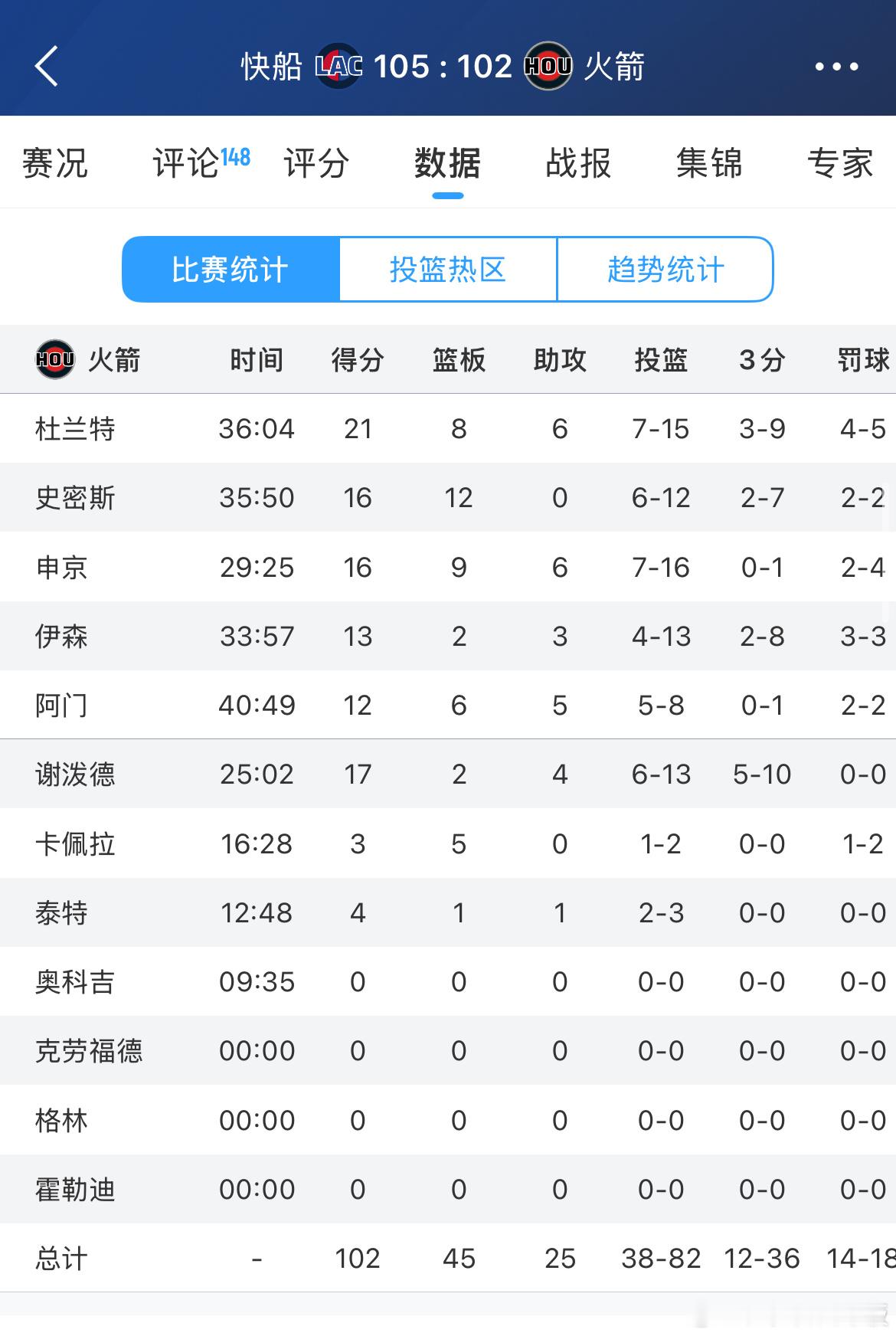 快船105-102战胜火箭!火箭和湖人差距回到1胜场