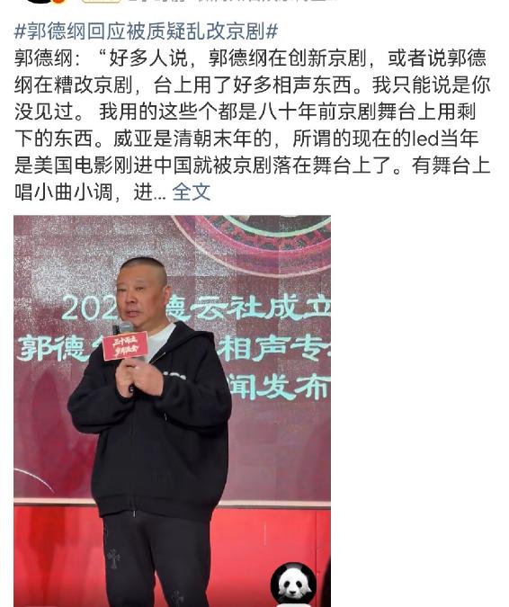 郭德纲,直接硬刚! 2月11日,郭德纲突然冲上了热搜,这次他不再客气,一段话字里行间都是不屑和自我认可:“好多人说,郭德纲在创新京剧,或者说郭德纲在糟改京剧,台上用了好多相声东西,我只能说是你没见过。…” 起因是,有人质疑郭德纲是在“糟蹋国粹”,他直接硬刚:“我用的都是八十年前京剧舞台上用剩下的东西,不是创新是复古”,一句话把争议拉到了新高度。 很多人对京剧的印象,就是穿着华丽行头、唱腔晦涩难懂,在大剧院里供着,台下坐的不是老人就是懂行的“业内人士”,仿佛京剧就该是高高在上、不食人间烟火的样子,可他们忘了,八十年前的京剧舞台,根本不是这样的。 那会儿的京剧,是扎根在街头巷尾、扎根在老百姓生活里的玩意儿,台上既有字正腔圆的唱念做打,也有诙谐接地气的包袱笑料,既有小曲小调的穿插,甚至还有吊威亚、用影像辅助的技巧。 美国电影刚进中国的时候,京剧舞台上就已经开始用类似VCR的形式烘托气氛了,这些现在被骂“不伦不类”的操作,都是当年老艺人玩剩下的,只不过后来有人把这些“烟火气”全给删了,把京剧包装成了高大上的艺术品,反倒让它离老百姓越来越远,到最后没人看、没人懂,就开始怪别人糟蹋国粹。 郭德纲最冤的地方就在这,他没瞎改,也没乱创新,只是把那些被删掉、被遗忘的老技法、老桥段,重新搬回了舞台,比如他创办的麒麟剧社,专门复排那些快失传的冷门老戏,很多都是市面上难得一见的老本子。 他在台上抖包袱、加小曲,甚至用现代灯光还原当年的舞台效果,本质上都是在复刻八十年前的演法,结果反倒被一群半瓶水晃荡的人,扣上了“糟改”的帽子。 更讽刺的是,骂他最凶的,要么是那些守着僵化唱腔、台下没几个观众的所谓“专业人士”,要么是根本没看过老京剧、只会跟风起哄的键盘侠。 郭德纲的硬刚,从来不是一时兴起的狂妄,而是对传承的底气,也是对当下京剧传承困境的无奈。他自掏腰包养了麒麟剧社长时间,哪怕亏损再多也不放弃,不是为了赚钱,更不是为了博眼球,只是不想让老祖宗传下来的东西,毁在这代人手里。 现在的麒麟剧社,能自己养活自己,巡演门票一开售就被抢光,台下举着手机拍照的,大多是二十来岁的年轻人,他们或许是因为郭德纲才走进剧场,但最后爱上的,是京剧本身,这难道不是最好的传承吗? 有人说他把相声和京剧混为一谈,可八十年前的京剧,本身就和相声、小曲不分家,都是老百姓茶余饭后的消遣,没有那么多所谓的“纯粹性”,所谓的“纯粹”,不过是后来人为划定的界限,把京剧越框越死,最后框得没了活路。 郭德纲的厉害之处,就在于他看透了这一点,他不跟那些人掰扯专业术语,也不辩解自己的唱腔多标准,只用一句“你没见过”,就戳破了所有的虚伪——你连八十年前的京剧是什么样子都没见过,凭什么评判我是在糟改?你连京剧的根是什么都不知道,凭什么谈传承? 说到底,当下京剧的困境,从来不是有人“糟改”,而是有人“死守”,死守着僵化的形式,死守着所谓的“正统”,却忘了传承的本质,是让艺术活下去,而不是供在博物馆里当标本。 郭德纲的“复古”,不是守旧,而是清醒,他知道,只有先让年轻人愿意走进剧场,愿意了解京剧,才能谈得上传承,只有把那些被遗忘的老东西捡回来,才能让京剧真正活起来。 那些骂他的人,与其在键盘上指责他糟改国粹,不如静下心来,去看看八十年前的老京剧,去看看麒麟剧社的演出,看看那些年轻人是怎么为老戏欢呼的,或许到那时,他们才能明白,郭德纲所谓的“复古”,才是京剧最该走的路。 郭德纲这波硬刚,怼的不是质疑,是无知;守的不是自己的名声,是老祖宗的宝贝,他用自己的方式告诉所有人:真正的国粹,从来不需要高高在上,真正的传承,从来不是墨守成规,能让老东西活下去、火起来,才是最硬核的底气,那些不懂装懂的人,还是先好好补补老京剧的课,再出来指手画脚吧。 (每天更新,欢迎关注,喜欢文章的可以帮忙点个赞留条评~) 对此大家有什么看法?