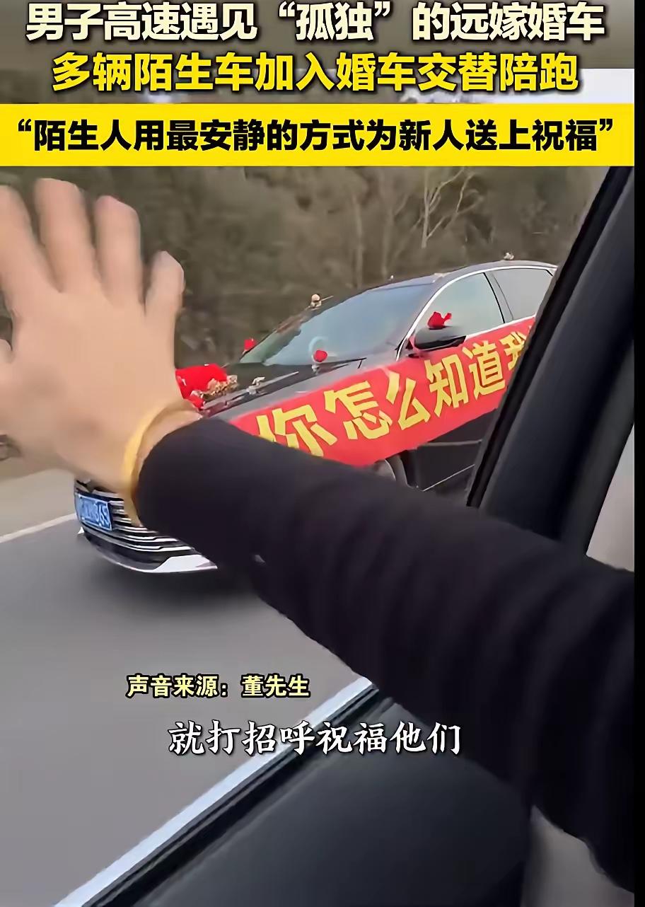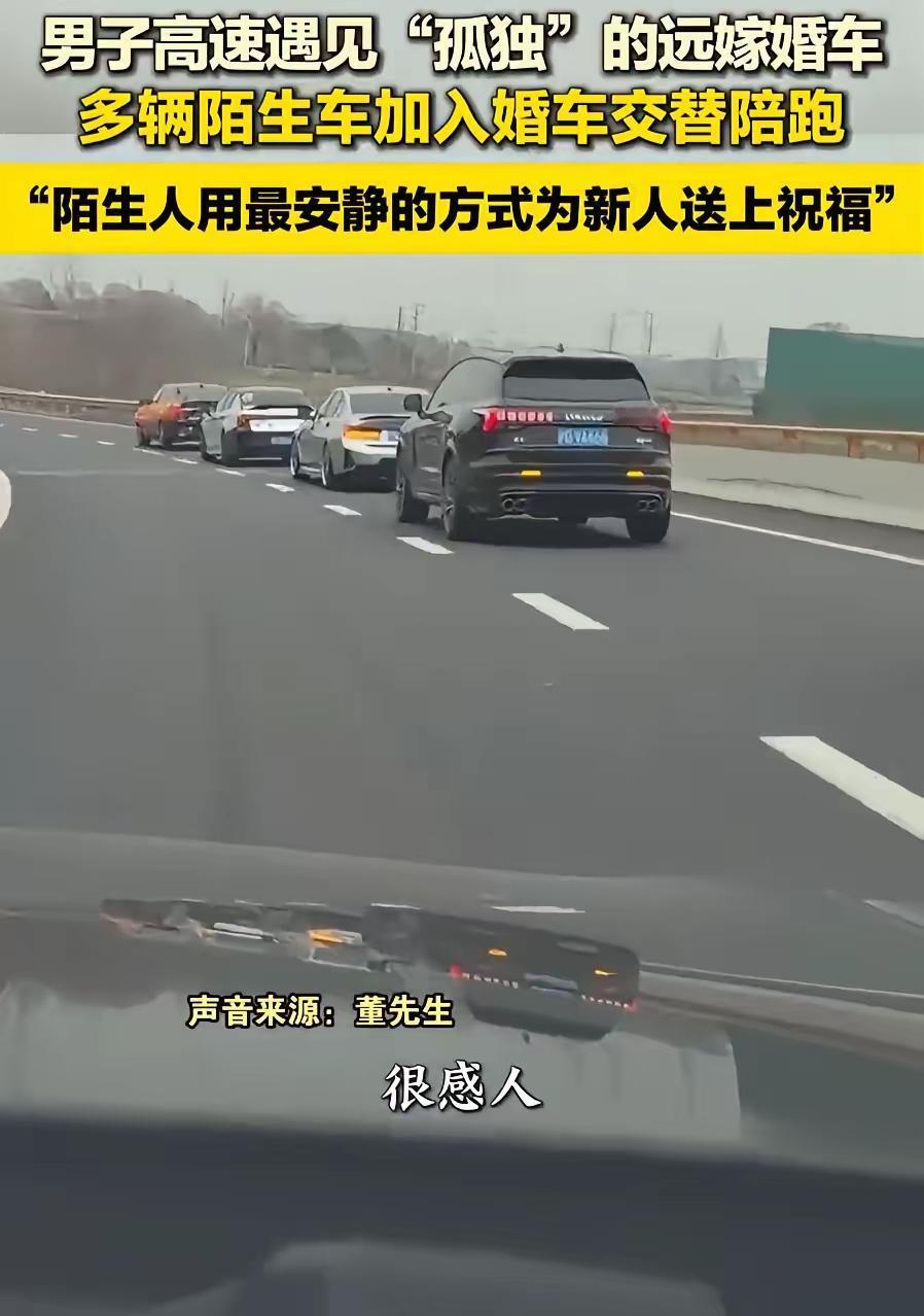 看哭了!上海,一男子开车上高速,突然在路上发现一辆远嫁的“孤独婚车”,没有车队,只有新郎默默开着车拉着新娘,而让人感动的是,高速路上很多陌生车辆看到后都不约而同的加入婚车交替陪跑,让这段路不再变的孤独 董先生介绍,自己本来是准备从上海回河南老家过年,开车跑高速时,看到一辆黑色轿车,上面有一些喜庆的装饰,侧面拉着一条红色横幅,写着“你怎么知道我把李婷娶到了!” 车里只有两个人,驾驶座上的新郎,和副驾驶上的新娘。没有车队,没有亲友,董先生明白这是一对远嫁的新人,正在奔赴新的生活 董先生降下车窗,朝他们挥手。新郎看到了,也笑着挥手回应。两辆车就这样并行了十几公里 接着,有趣的事情发生了 前面一辆白色SUV似乎也注意到了这辆婚车,它减速靠近,鸣笛两声,像是在送上祝福。然后它开到婚车前面,保持着不远不近的距离,仿佛成了临时车队的一员 再往前,一辆货车也从右侧车道慢下来,司机探出头来,朝婚车竖起大拇指。经过收费站时,工作人员看到横幅,也笑着对新郎新娘说了句“恭喜” 一路上,不断有车辆加入这个行列。有的并行一段路,鸣笛祝福;有的开到前方,为他们领航一段;有的跟在后方,像是守护。没有约定,没有交流,这些陌生的司机们就这样自发地形成了一支临时车队,陪伴这对新人走了一程又一程 说实话,这个事并不大,却让人看的心里暖暖的,每个人都有自己的目的地,都行色匆匆。但正因如此,那些短暂的陪伴才显得格外珍贵 这些司机们没有停下自己的行程,没有过度打扰,只是用最简单的方式告诉这对新人:你们不孤单,这一路有人看见你们的幸福,并且愿意为这份幸福护航一小段 相信这对新人会记得这一天,不止因为是他们结婚的日子,更因为在这一天,无数陌生人为他们组成了一支车队。而参与其中的司机们,大概也会记得——在某个寻常的回家路上,他们曾偶然成为别人婚礼的见证者