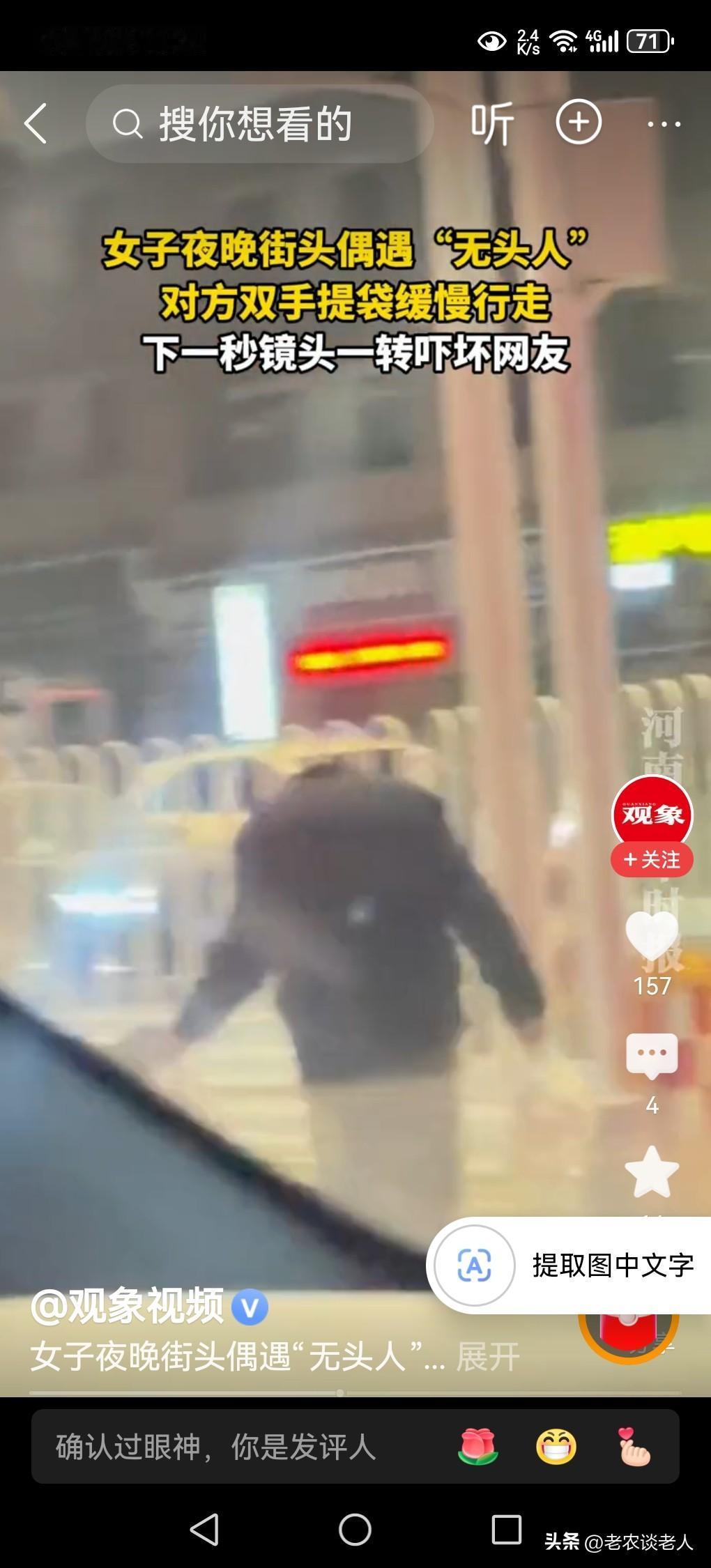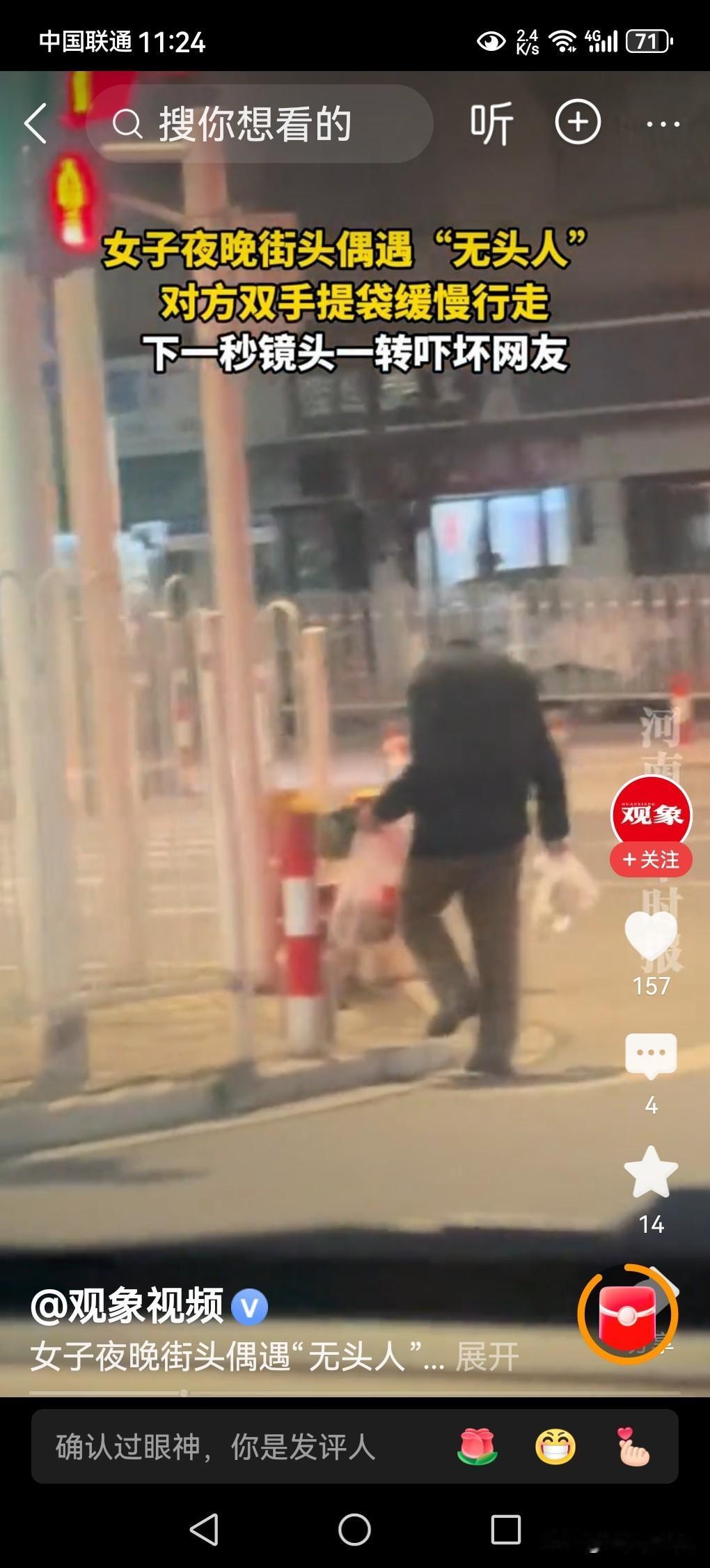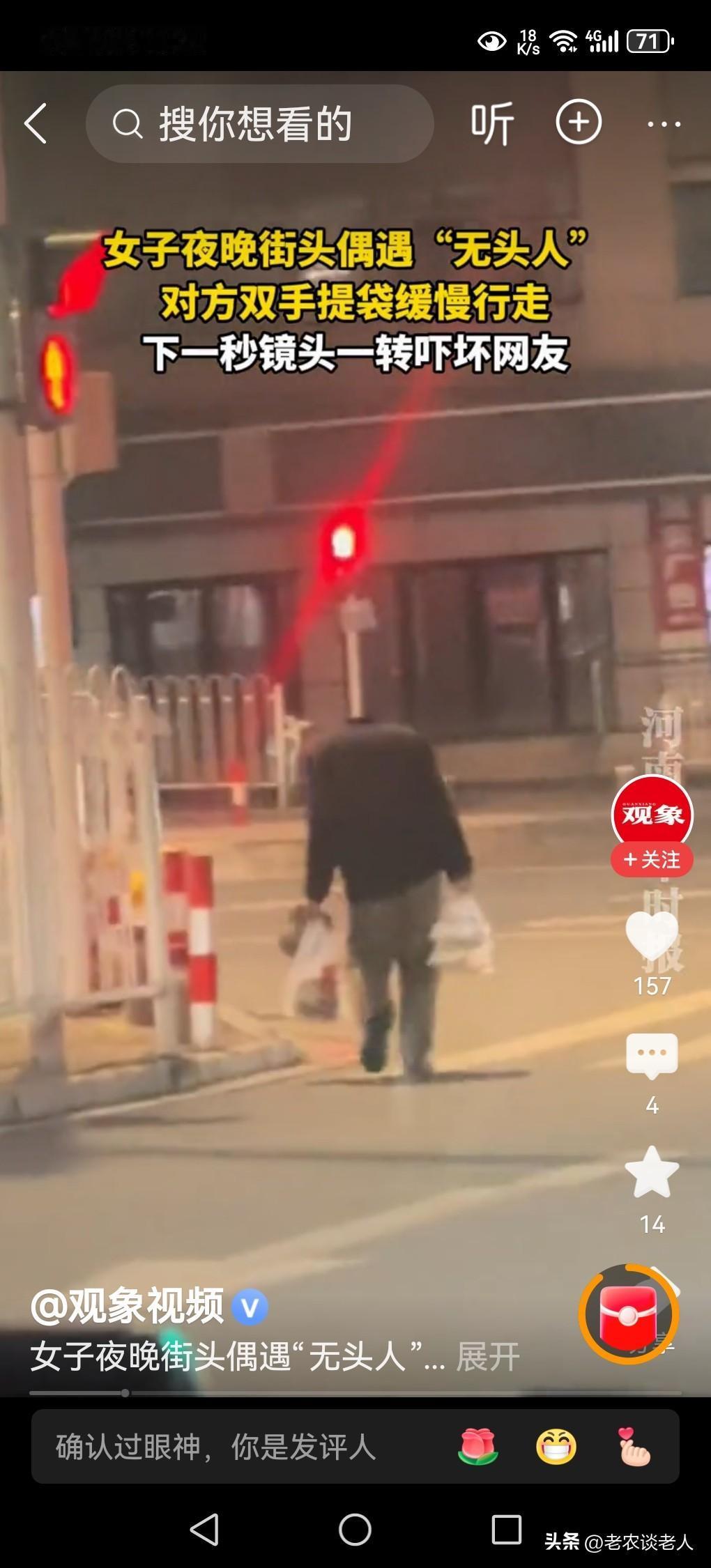 女子夜晚街头偶遇“无头人”!有图有视频有真相,千真万确是有此事,太令人不可思议了,世间真的有“无头人”吗? 据媒体2月12日报道,一位女子开车,在夜晚街头发现,有一位“无头人”,双手提着方便袋子,在路边行走。 这是一种幻觉吗?这是一种光学折射的不原理造成的原因吗?这是不是一种神话?是不是一种传说?但是毕竟有图有视频为证,有真相,不可能是造假的!这究竟是什么原因?确实令人不可思议。 难道这个世界上真的有“无头人”吗?这个视频让人一看,不由得全身冷汗,起鸡皮疙瘩,心里开始发术!大家都来看看是真是假? 以上是本人观点,如有不妥,请大家在留言区中留下你宝贵的意见,并积极参与评论。