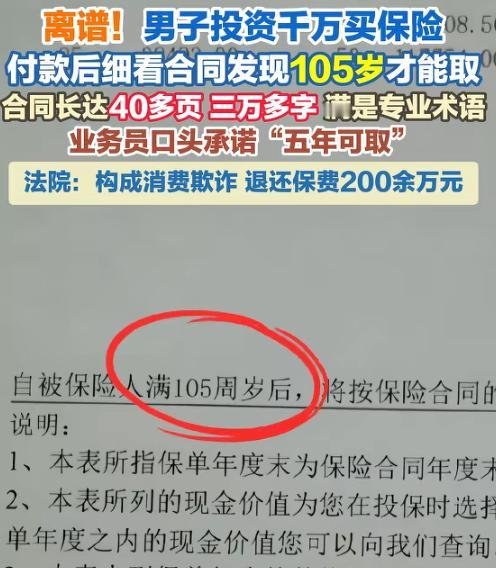 差点倾家荡产!北京,男子出于信任,将1000多万的资金,交给合作多年的保险业务员打理。双方交流时,男子再三称,这是公司周转的钱,并约定5年连本带利取回。当男子查看保险合同时,猛然发现,本金要等到他105岁才能取出,男子顿时懵了,马上提出退保,保险公司立马翻脸拒绝。男子告上法庭,要求撤销保险合同,返还保费及利息损失,法院判决,还了男子一个公道! 张先生在北京开着一家小企业,1000多万是他维持公司运转、发工资付货款的救命钱,半点不敢差;而李某是他合作多年的保险业务员,之前合作都很顺畅。   “张总,这款太适合你了,5年连本带利取,比银行稳,不耽误你公司周转。” 去年年初,李某主动找上门,推销一款“高收益短期理财险”,直戳张先生痛点。 李某依旧拍着胸脯承诺,只要把钱存进去,约定5年期限,到期后就能连本带利全额取出,收益比银行定期高不少,还能兼顾资金安全。   “这是我公司的命根子,1000多万,必须保证5年能连本带利取出来,出一点事,我就完了。”张先生当场警惕,语气沉重地反复叮嘱。   “放心,咱俩这么多年交情,我能害你?合同我帮你弄,全程不用你操心,5年到期,你随时取。”面对张先生的再三强调,李某拍着胸脯打包票。   被多年信任冲昏头脑的张先生,没多想就答应了,全程跟着李某的指引签字、转钱,连合同条款都没翻一页,因为他从没想过,老熟人会背后捅刀。   直到几个月后,公司资金链紧张,张先生急着取部分钱应急,翻出合同一看,瞬间如遭雷击,浑身冰凉。   合同上白纸黑字写着:投保人需年满105周岁,才能支取全部本金;中途退保,仅退少量现金价值,还要扣高额手续费。   “我今年才40多,105岁才能取?”张先生瞬间崩溃,他终于明白,李某从一开始就没打算兑现承诺,全程都在骗他。   “张总,合同上写得明明白白,是你自己不看,跟我没关系。”他疯了一样拨通李某电话,怒吼着要求退保、返钱,可电话那头的李某,早已没了往日热情,语气冷淡又敷衍。   张先生气得浑身发抖,厉声质问他当初的承诺,可李某只反复说“一切以合同为准”,最后干脆挂断电话,彻底失联。   走投无路的张先生,只能亲自找上门找保险公司,可对方的态度,比李某更绝情,直接翻脸拒退。   “合同是你自愿签的,签字就代表认可所有条款,口头承诺不算数,不退。”工作人员语气生硬,半点协商余地都没有。   那一刻,张先生彻底慌了——业务员失联,保险公司拒赔,1000多万救命钱被套死,他的公司随时可能破产,几十年心血将付诸东流。   万幸的是,张先生留了个心眼,当初和李某的聊天记录、通话录音,都完整保存着,还有他再三强调是公司周转钱的对话,这都是铁证。   抱着最后一丝希望,张先生聘请律师,一纸诉状将保险公司告上法庭,要求撤销合同、返还全部保费及利息。   法庭上,双方激烈交锋,矛盾彻底爆发。   保险公司依旧强硬:“合同自愿签订,张先生是成年人,理应看清条款,业务员口头承诺不算数。”   而张先生的律师,当庭提交录音、聊天记录,字字铿锵反驳:“业务员明知这笔钱是公司救命钱,却故意隐瞒‘105岁取本金’的核心条款,虚构5年可取的承诺,这就是赤裸裸的欺诈。”   法院审理后,最终给出公正判决:业务员构成欺诈,撤销保险合同,保险公司10日内返还张先生1000余万元保费及相应利息。   拿到判决书的那一刻,张先生再也忍不住红了眼,压在身上的巨石终于落地,公司保住了,公道也终于来了。   这起案件,越看越气。业务员利用信任下套,保险公司翻脸不认人,若不是张先生留了证据,这辈子都别想拿回救命钱。   最后提醒所有人:大额资金往来、签合同,千万别信口头承诺!不管关系多好,务必逐字看条款,留存好证据——人心隔肚皮,谨慎才能防坑。 对此您有什么看法?欢迎大家到下方评论区留言共同讨论。 信息来源:大象新闻《男子投资千万买保险付款后细看合同发现105岁才能取》 文|灰度场 编辑|南风意史