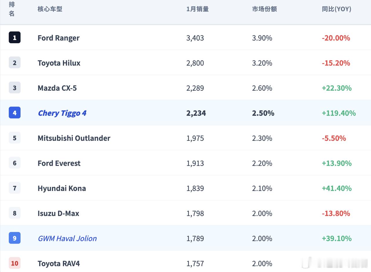 2026 年 1 月澳大利亚车市整体近乎零增长,日本品牌销量大幅下滑,中国品牌却实现暴涨,市场份额大幅提升,当地每卖出四台车就有一台来自中国。