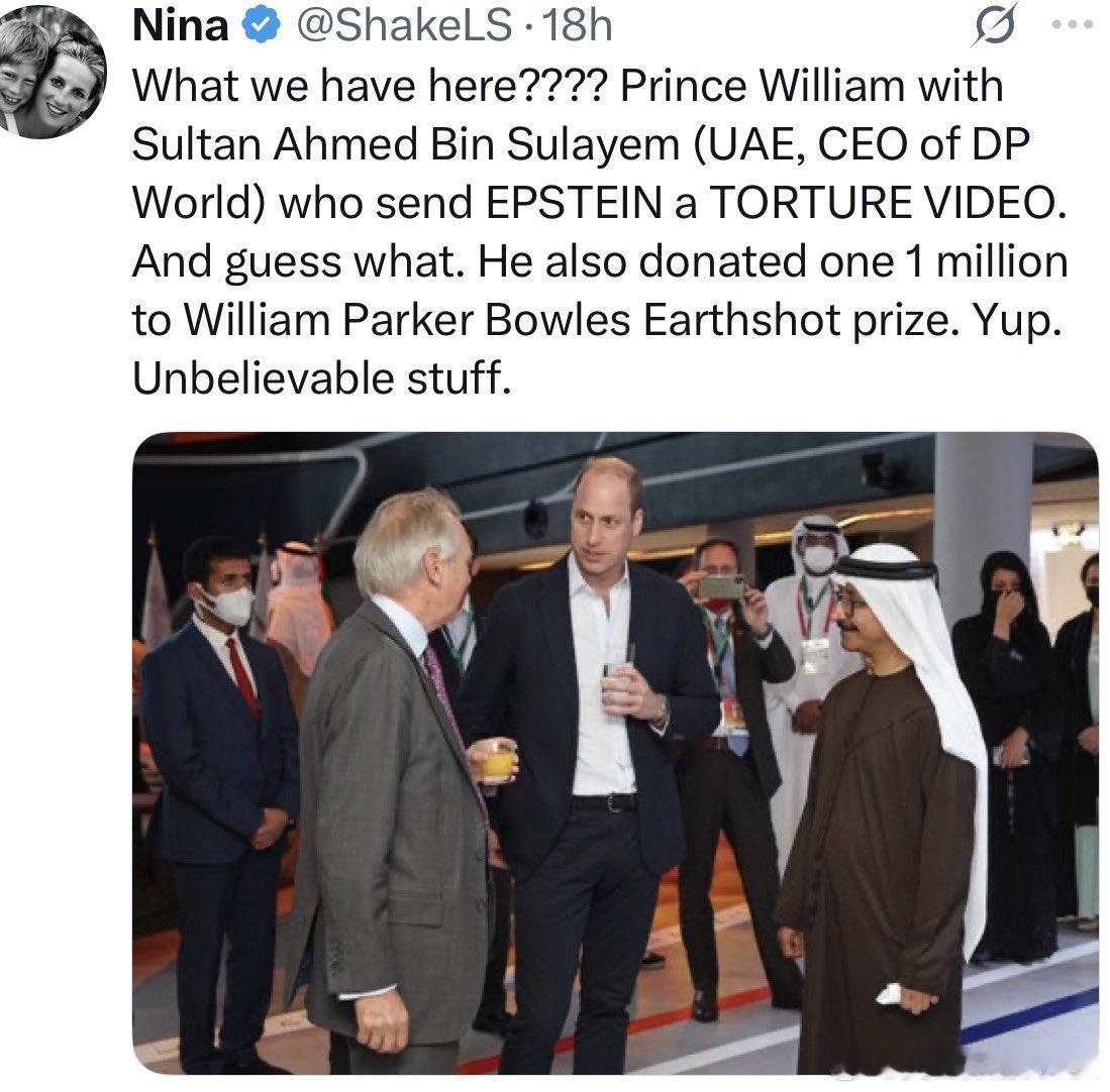 有消息称,阿联酋亿万富翁、DP World 董事长兼首席执行官苏丹·艾哈迈德·本·苏莱姆被牵涉进了爱泼斯坦丑闻。2009年4月,在他仍在棕榈滩监-狱-服-刑18个月但获准工作释放时,爱泼斯坦给苏莱姆发邮件说:“你在哪里?你还好吗?我很喜欢那个虐-待视频。”DP World 是 Earthshot 的“创始合作伙伴”,已向该慈善机构捐赠至少 100 万英镑。