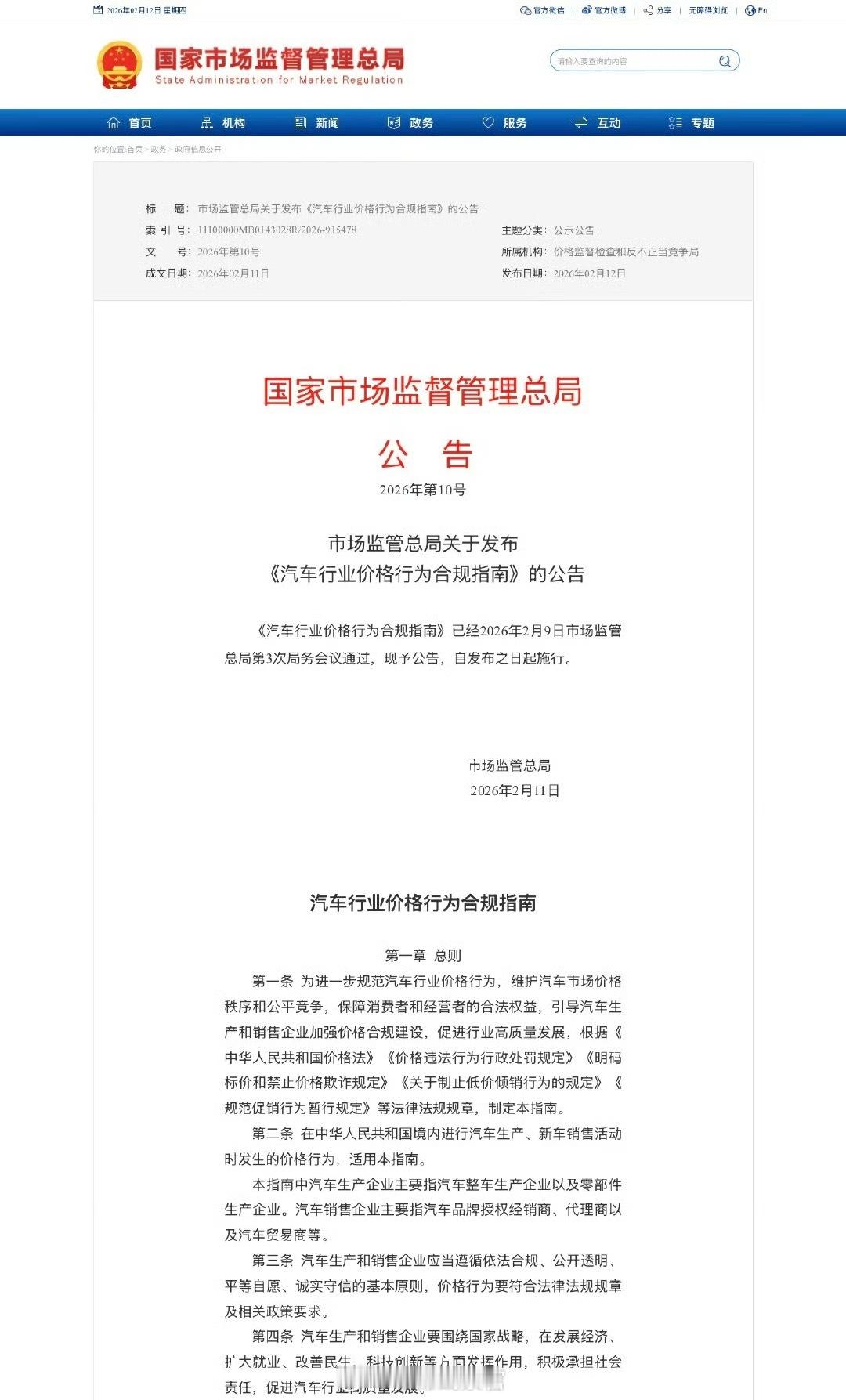 市场监管总局发布《汽车行业价格行为合规指南》。其中提出,汽车生产企业除了依法降价处理积压商品外,以排挤竞争对手或者独占市场为目的实施下列价格行为,存在重大法律风险: