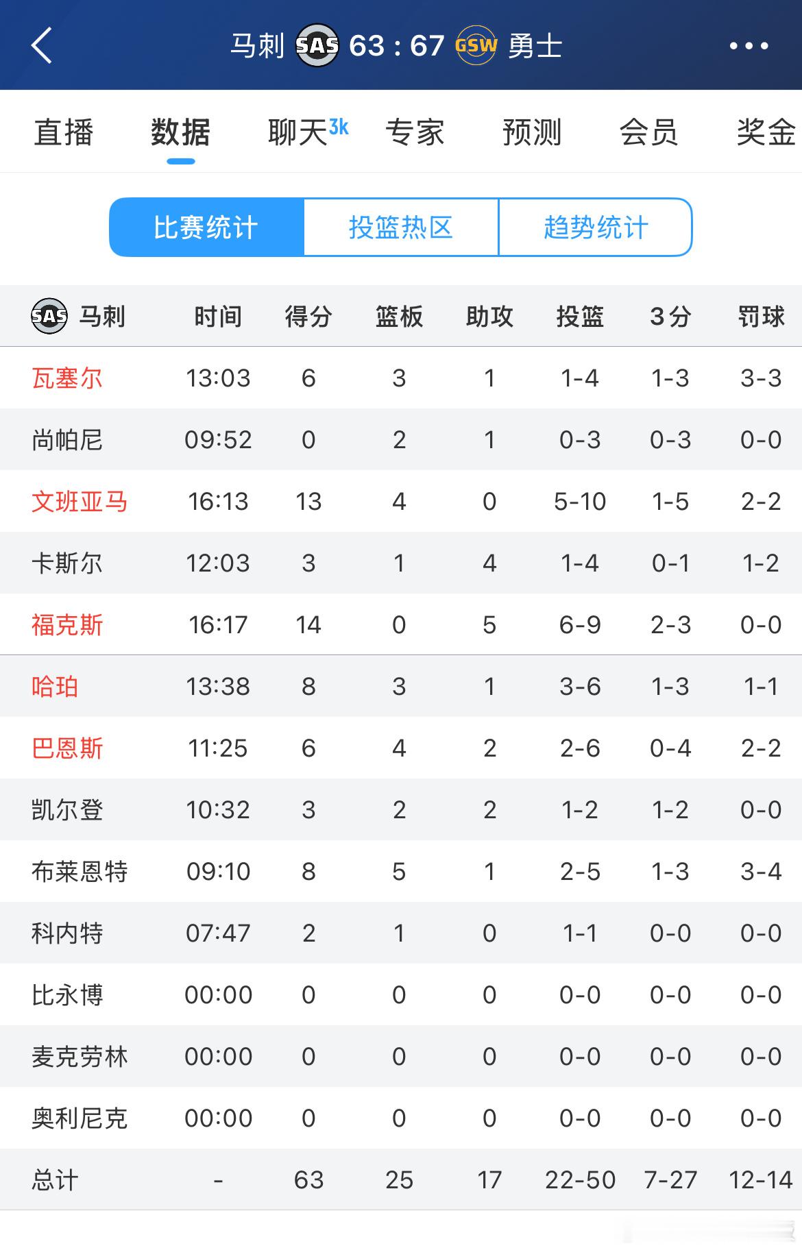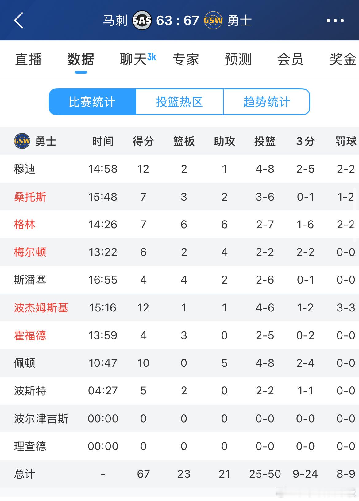 勇士半场领先马刺4分,文班亚马目前只得到13分4板,10中5
