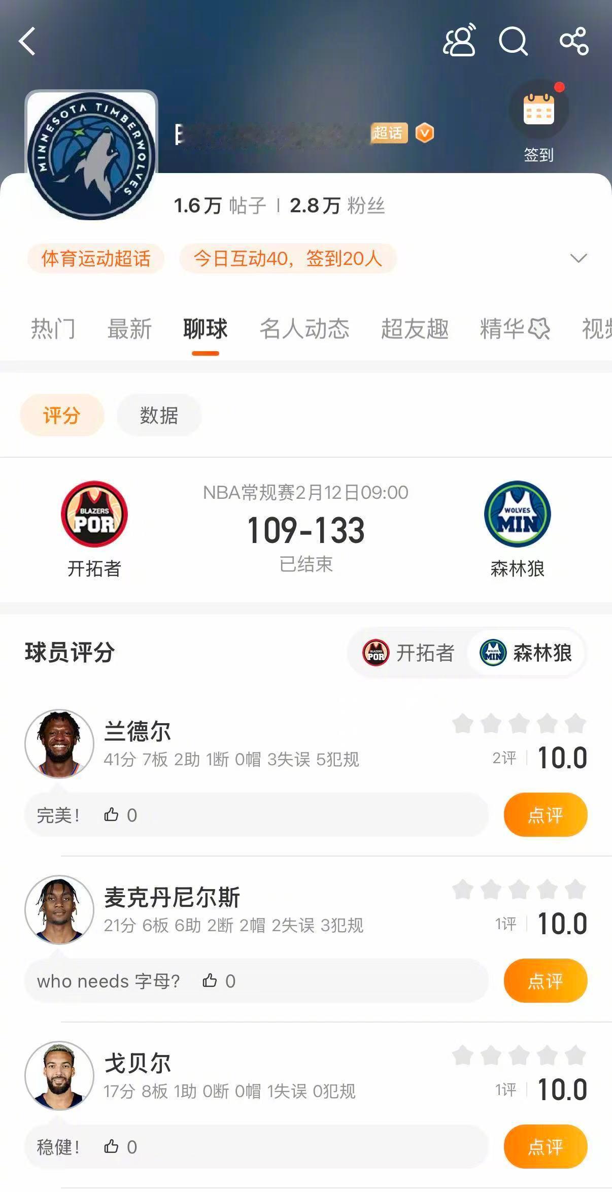 欢迎大家进入球队超话明尼苏达森林狼波特兰开拓者 对球员表现进行评分!!杨瀚森双手补扣