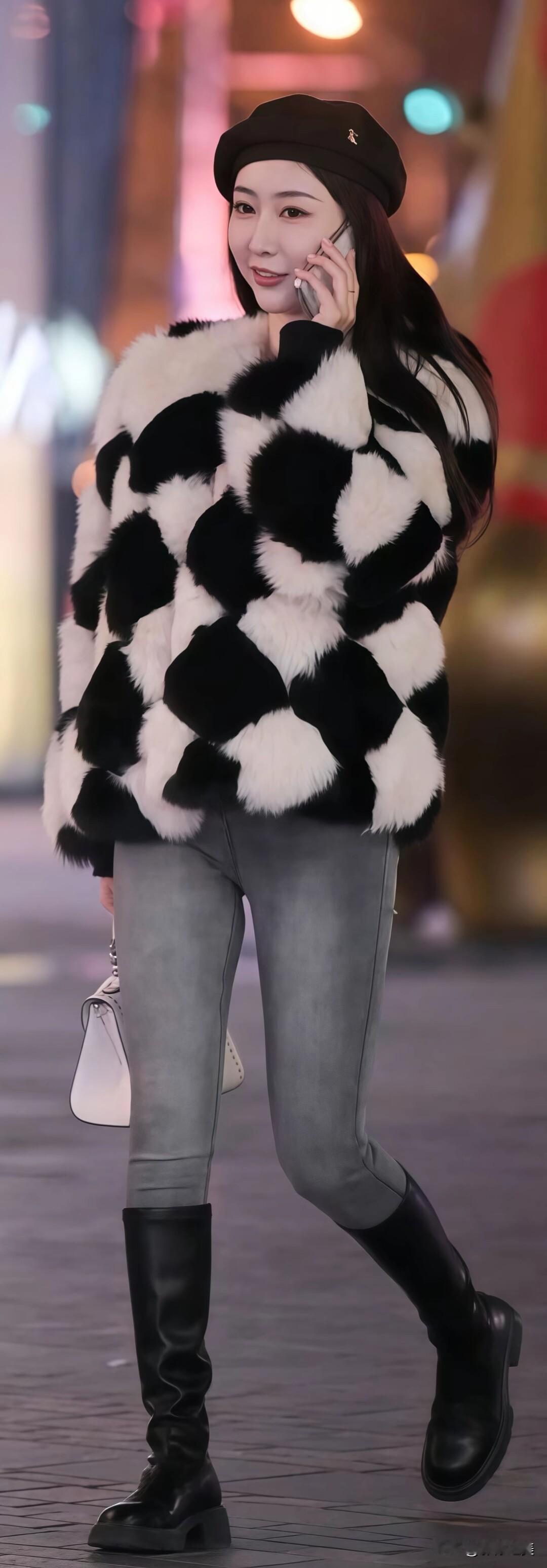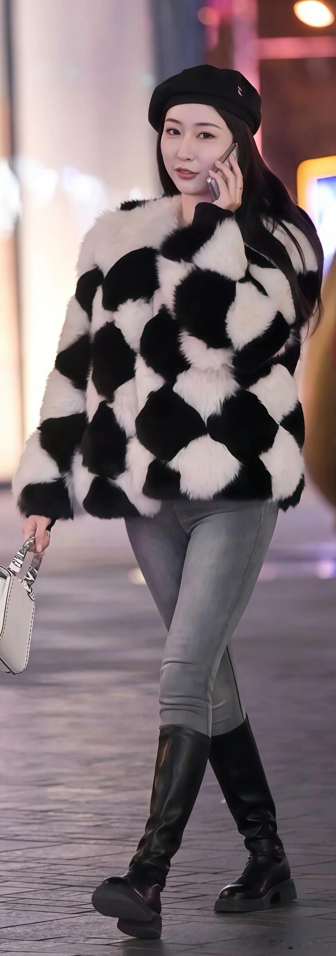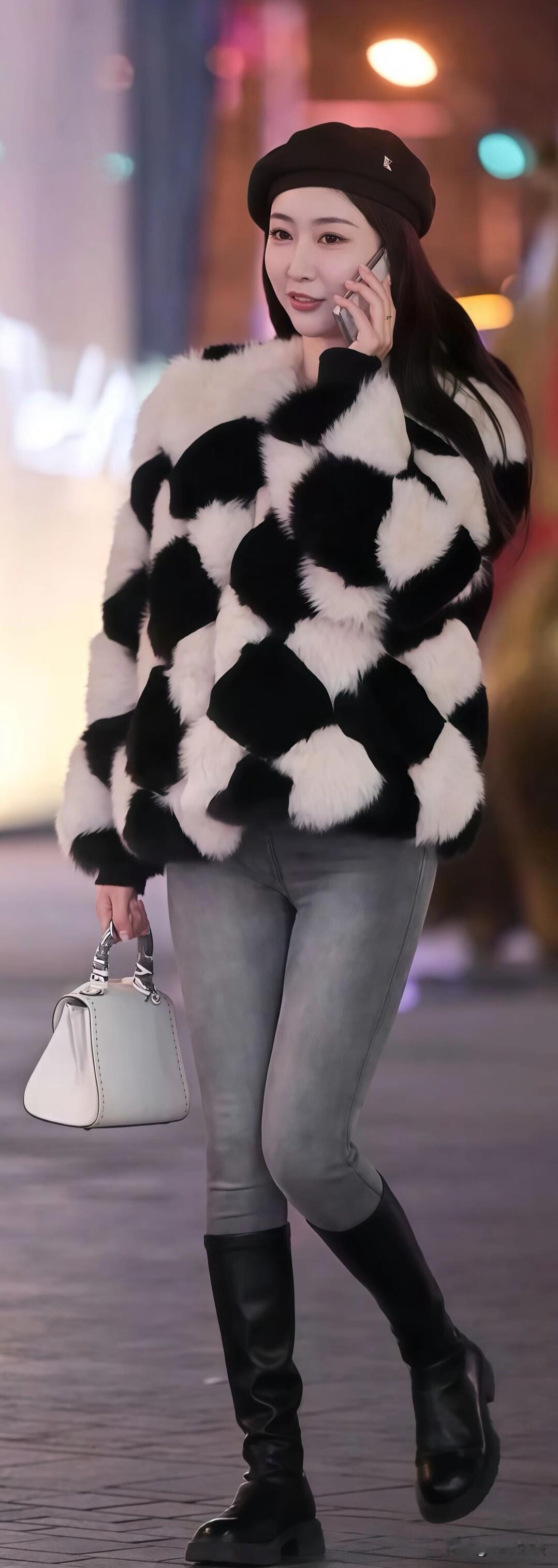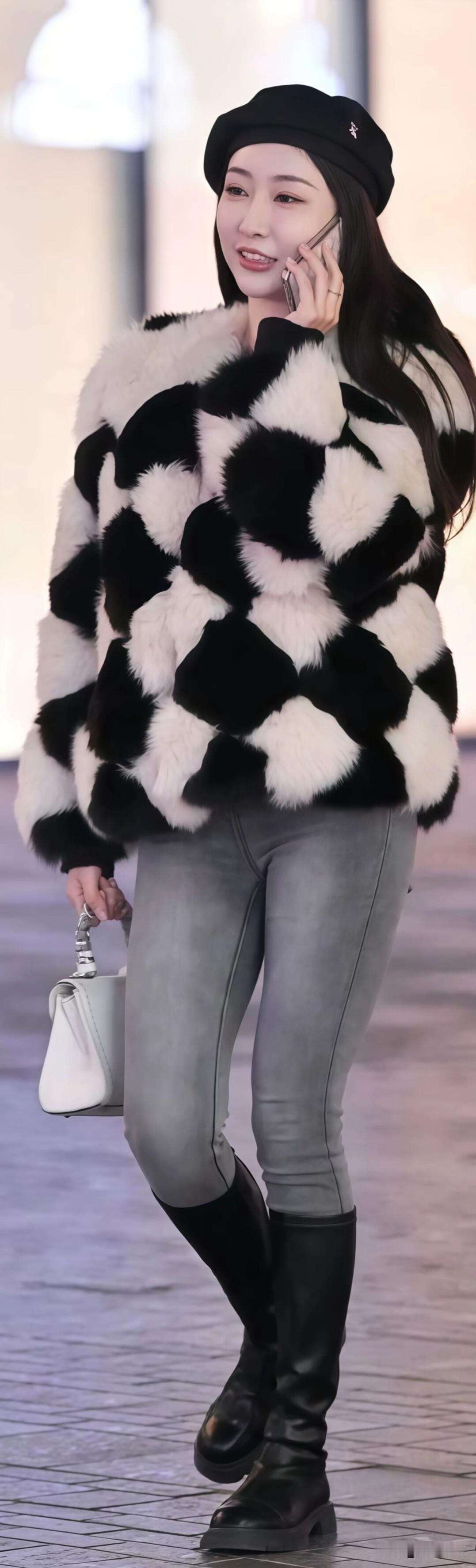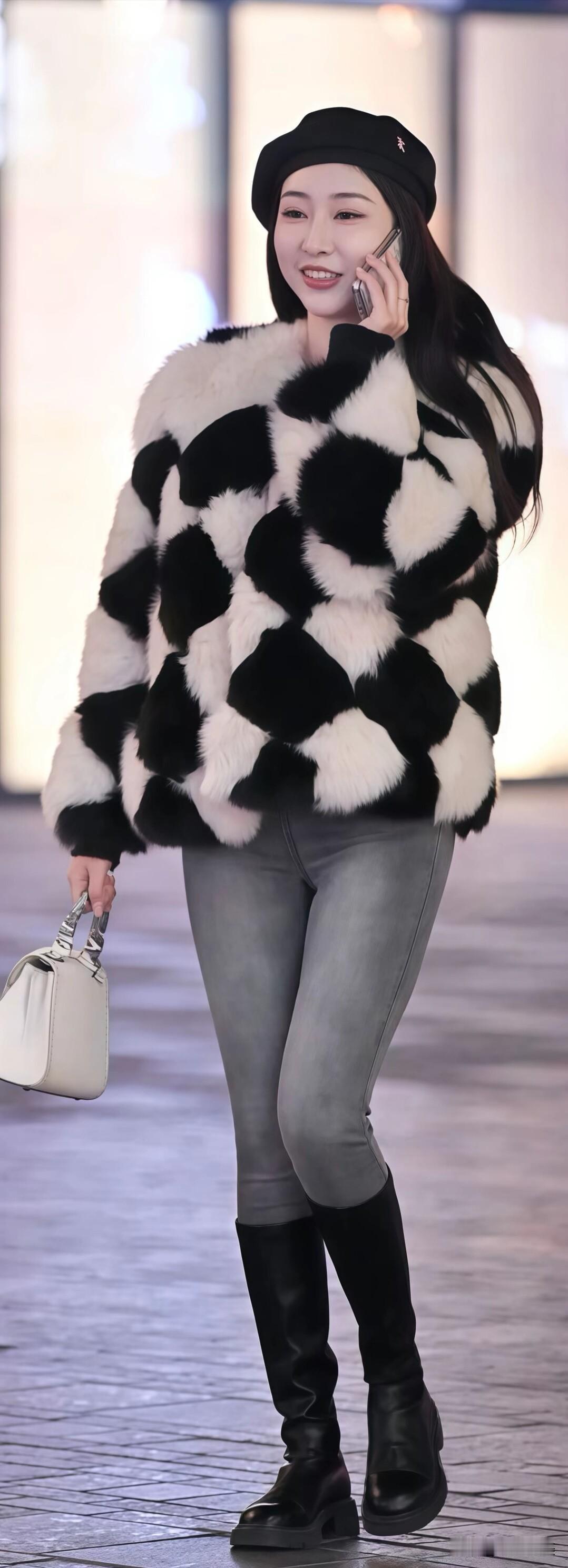 黑白棋盘格皮草太吸睛!软糯显贵又不挑人,搭配灰裤长靴利落显瘦,冬日街头氛围感直接拉满。