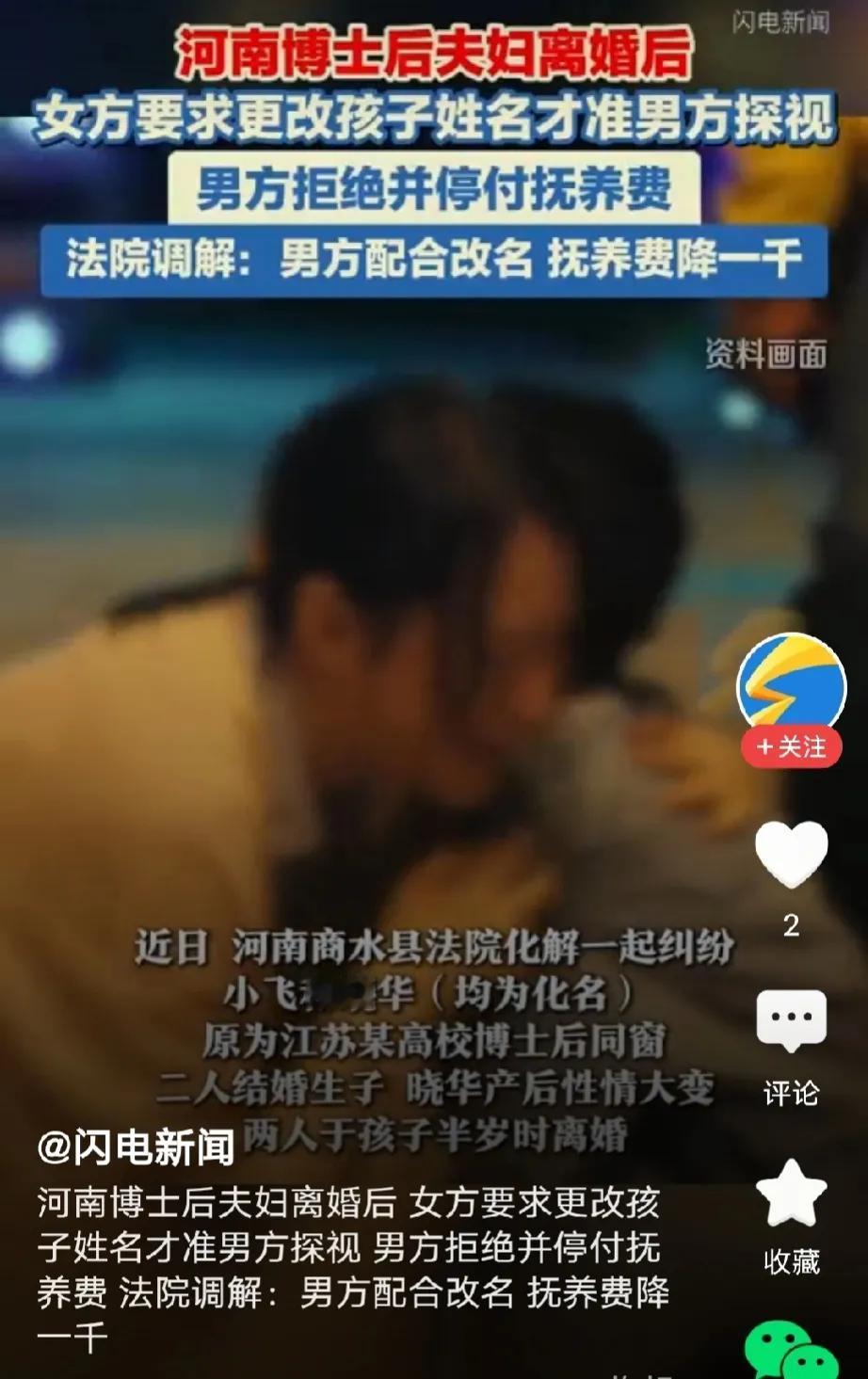 河南商水,博士后男子离婚后按月支付2000抚养费,孩子归前妻抚养。半年后,前妻突然要求给孩子更名,男子坚决不同意,竟被直接拉黑。他怒停抚养费,反手将前妻告上法庭,本以为占理,没想到法院判决直接让他傻眼。 小飞和晓华曾经在江苏某高校攻读博士后,两人也是在那里相识、相知、后来相爱相恋。 毕业后,感情稳定的两人顺利走进了婚姻殿堂。 婚后生活温馨和睦,不久后晓华便怀上了宝宝,随着孩子的平安降生,这个小家庭一度充满了欢声笑语。 在旁人看来,这对高学历夫妻事业有成,又有了他们的爱情结晶,本该是最幸福美满的模样。 谁料,晓华自从生下孩子后,性情大变,她动不动就发火,看哪、哪都不顺眼,跟小飞之间矛盾不断,争吵也变多了起来。 孩子半岁大的时候,小飞实在受不了,最终两人和平分开。 离婚后,孩子归晓华抚养,小飞每个月支付2000元抚养费,并享有随时探视权。 本想着从此各自安好,小飞有空的时候也过去看看孩子,不是夫妻还是朋友,可这一切和谐在半年后发生了变化。 大概半年后,晓华突然提出要给孩子改名,改成跟她同一个姓。 小飞一听立刻不乐意了:好好的孩子,凭什么要改名?自古以来孩子都是随父姓,如今孩子已经跟着前妻生活,若是连姓氏都改了,他这个当爹的,往后和孩子之间仅有的一点联结,恐怕也要彻底断了。 所以,小飞拒绝了孩子更名的要求,晓华在多次跟小飞沟通无果后气得直接拉黑了小飞。 小飞在多次联系不上孩子后,直接断供抚养费,并把晓华告上法庭。 最终,经过法院反复调解,小飞和晓华终于达成了一致:小飞同意配合办理孩子的改名手续,作为条件,孩子的抚养费从每月2000元降到了1000元。 同时小飞也保住了自己的探视权,每季度可以探望孩子,每2年还能带孩子外出游玩一次,最后双方在线上签署了这份协议。 对此,有网友热议:女人强行给孩子改名,男人凭啥还得乖乖掏钱?凭啥做冤大头花钱养一个外姓孩子?别扯什么亲生骨肉,知道什么叫家族吗?家族的根是同姓,血缘都得往后排! 不是同一个姓,哪怕流着你的血,在宗族眼里也是外人!现在倒好,改了姓还想让爹全额养,天底下哪有这道理?抚养费降一半怎么了?这是对剥夺姓氏权的起码制衡,不然谁还认这个爹? 可有人就问了:抚养费是血缘确定的,和姓啥有关系吗?凭啥说降就降一千?今天拍个脑门改个姓,明天拍个脑门改个价,把法理和人情拍得稀里哗啦。 说到底,姓氏从来不是孩子的枷锁,而是父母对责任的承诺。当母亲把姓氏当成博弈的筹码,父亲把抚养费当成反击的武器,最后受伤的永远是夹在中间的孩子。 这场闹剧里,没有赢家,只有一个被姓氏和金钱裹挟的童年。 这场闹剧背后,其实有明确的法律边界,我们不妨从法理层面再做一层解读。 根据《民法典》第1015条规定,子女可以随父姓,也可以随母姓,但变更未成年子女姓名,必须由父母双方协商一致,任何一方无权擅自更改。 同时,《民法典》第1085条及相关司法解释明确规定,父母不得因子女变更姓氏而拒付子女抚养费,抚养费是基于血缘关系的法定义务,与姓氏归属并无关联。 在本案中,法院调解协议将抚养费从2000元降至1000元,并非法律强制规定,而是双方自愿协商的结果。 这提醒我们:姓氏争议可以协商,但不能以此绑架抚养义务;抚养费是保障孩子成长的底线,不应成为博弈的筹码。 任何将姓氏与责任挂钩的做法,本质上都是对未成年人权益的忽视。 对此,各位网友怎么看?欢迎留言交流。
