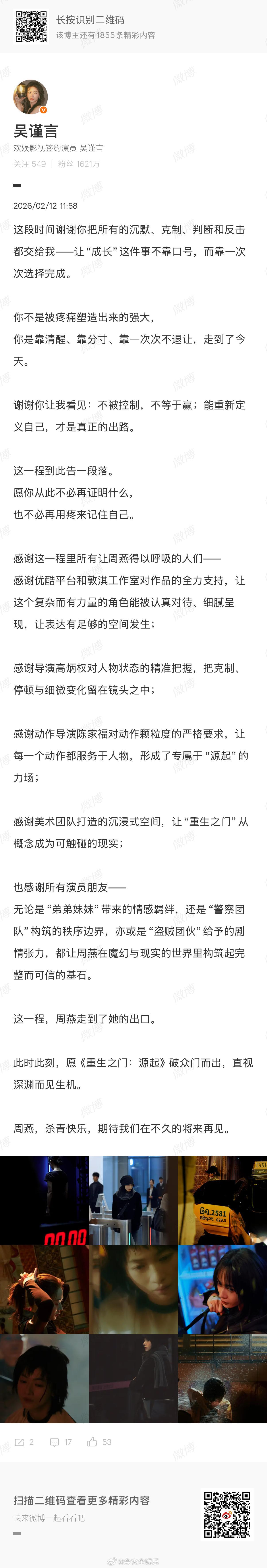 恭喜杀青吴谨言重生之门杀青长文吴谨言重生之门杀青发长文