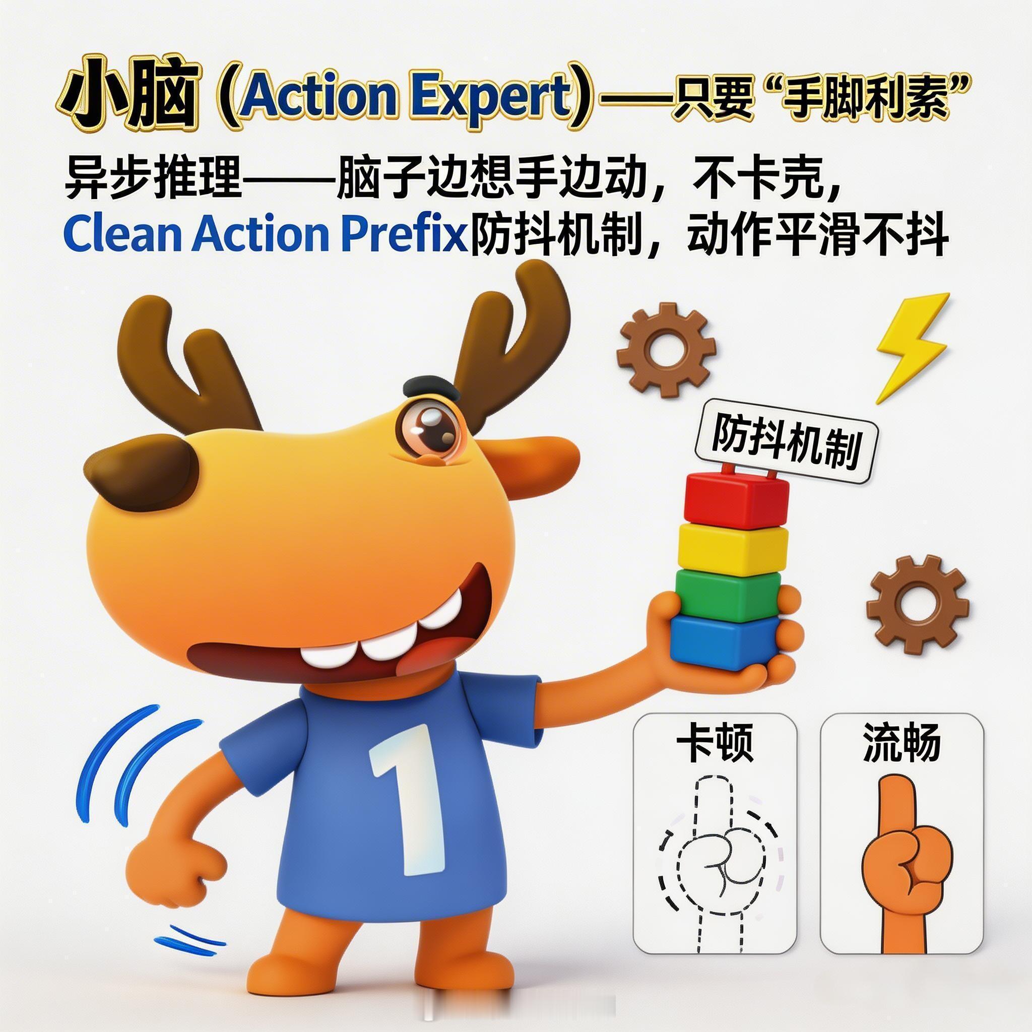 2️⃣ 小脑(Action Expert)——负责“手脚利索”很多机器人反应慢,是因为“脑子想完了再告诉手”,中间有延迟,动作一顿一顿的。小米这个模型用了异步推理——脑子边想手边动,不卡壳。还加了个“防抖机制”(Clean Action Prefix),让动作像人一样平滑,不会抽风式乱抖 。
