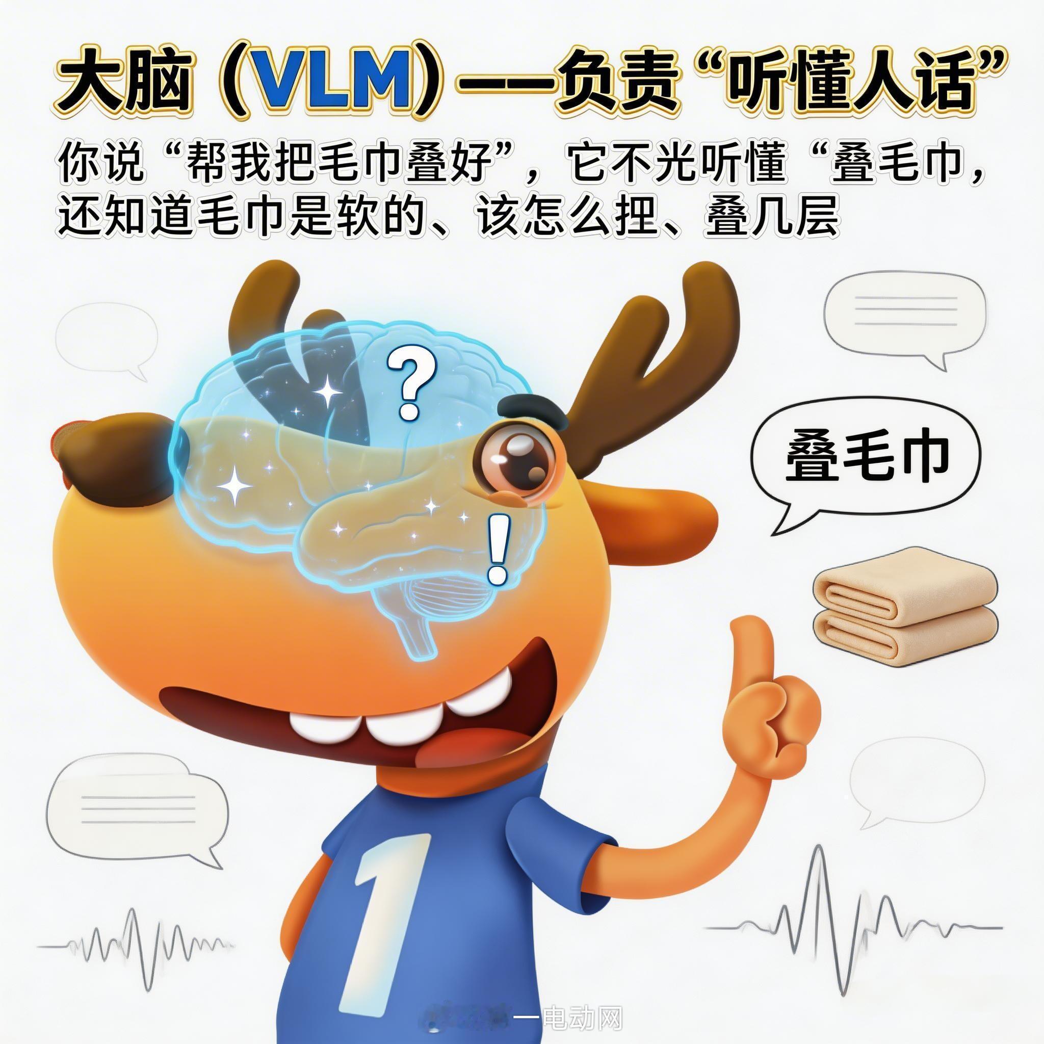 打个比方:它等于给机器人装了个“大脑+小脑”组合包1️⃣ 大脑(VLM)——负责“听懂人话”你说“帮我把毛巾叠好”,它不光听懂“叠毛巾”,还知道毛巾是软的、该怎么捏、叠几层。之前的机器人经常听不懂模糊指令,这个能听懂 。