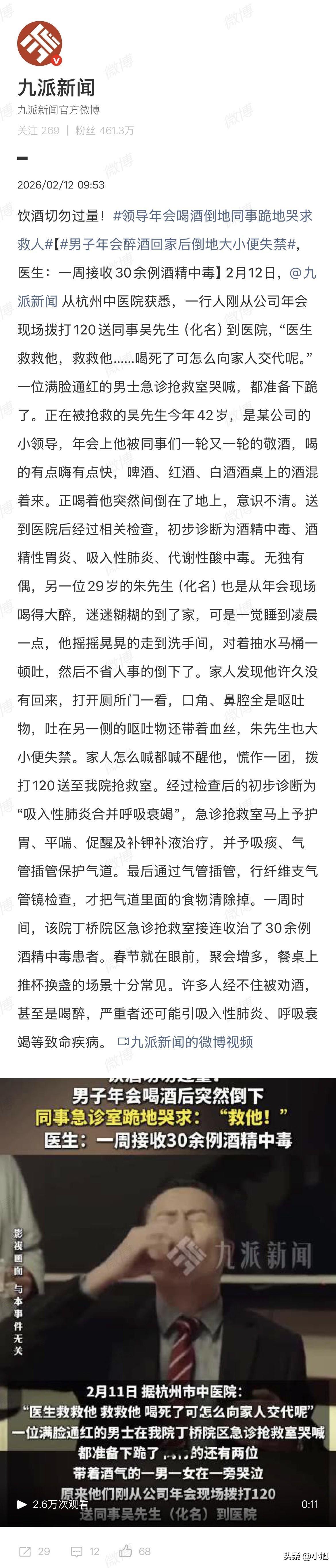 医生救救他,救救他! 杭州一家医院急诊室,一个满脸通红的中年男人拽着白大褂,腿一软差点跪地上。旁边担架上躺着他同事吴先生,42岁,公司小领导,年会喝倒了。 同事声音都劈了:喝死了怎么向家里交代啊。 吴先生躺在那里没反应。医生说他是酒精中毒、吸入性肺炎。啤酒红酒白酒混着灌,喝着喝着突然人就直直倒下去,现场一片尖叫。 同样那天夜里,29岁的朱先生被家人发现倒在自家厕所。 他是年会喝醉被人送回家的,凌晨一点晃晃悠悠爬起来去吐,趴在马桶上吐完就没声了。 老婆以为他回房睡了,过了半小时厕所灯还亮着,推开门——人横在地上,口角、鼻腔全是黄绿色的呕吐物,吐到马桶圈上那摊东西里头掺着血丝。 大小便失禁,怎么喊都不醒。 医生从朱先生气管里吸出来的,全是夜里吃的那顿饭。 他昏迷了,喉咙没力气,吐出来的东西没出去,全呛进肺里。这叫误吸。血氧掉到85%,急诊立马插管。 一周时间,光是杭州这家医院就收了30多个酒精中毒。 其实这种场面年年春节前都要演一遍。 遵义有个24岁的小伙子,喝650毫升白酒,吐的时候吸进肺里,CT一做,支气管堵满了食物残渣。医生拿纤维支气管镜一点一点往外吸,吸完在ICU躺了6天。 宁波那个30岁的小陈更倒霉,年会被领导劝酒,一斤白酒下去,剧烈呕吐把贲门生生撕裂了。贲门是食管和胃的接口,吐得太猛,像撕纸一样撕开一道口子,血哗哗往外涌,送到医院人已经休克。 长沙38岁的邓杰军也是喝了一斤多白酒,气道被呕吐物堵死,血氧一路掉,差点没醒过来。 很多人不知道,喝酒喝死人往往不是酒精直接杀的,是自己吐的东西把自己呛死的。 醉酒的人吞咽反射和咳嗽反射都没了,仰面一躺,胃里的东西返上来直接灌进气管,几分钟人就没了。 默沙东诊疗手册写得清楚:胃酸对肺是化学灼伤,食物残渣是细菌的培养基,两个加一起就是吸入性肺炎。 医生有个规矩——绝对不让醉酒的人仰卧。侧躺,背后垫个枕头,这是保命的姿势。 但年会上谁想这些。 吴先生被一轮一轮敬酒,他是领导,不喝就是不给大家面子。喝到后来舌头大了,眼神散了,周围的人还拍手叫好。 等他倒地了,刚才敬酒最凶的同事,跪在急诊室地上哭。 这场景像不像咱们身边每年都发生的事。 年底聚会,酒桌上越热闹,急救室越忙。劝酒的说感情深一口闷,喝倒的说不喝不给面子。面子到底值多少钱,没人算过。账都记在急诊室的账单上。 如果你在场,会上去挡那杯酒吗? 还是跟着一起敬?