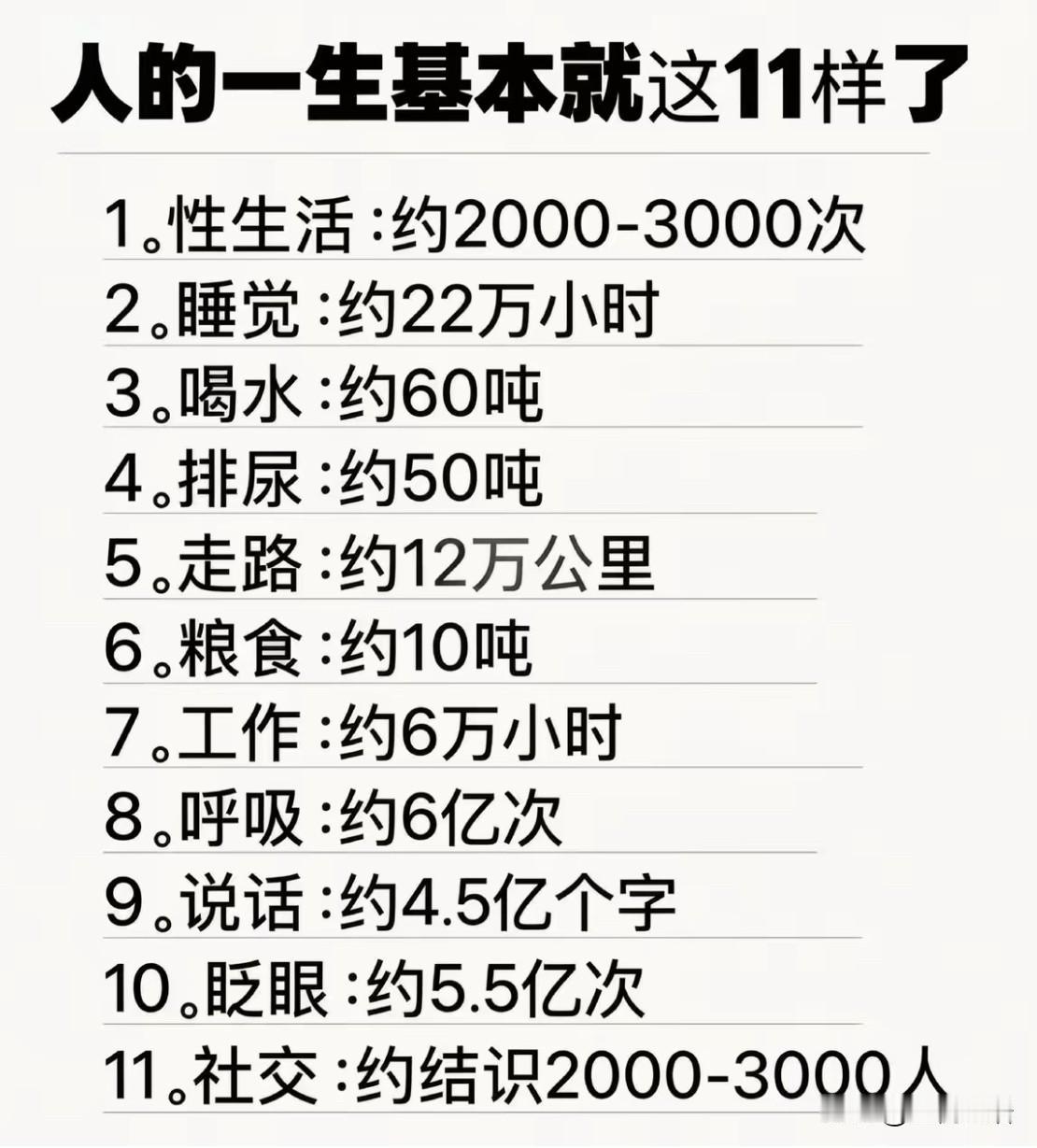 究竟什么才是人生的顶级享受? 人的一生基本就这11样了: 1。性生活:约2000-3000次 2。睡觉:约22万小时 3。喝水:约60吨 4。排尿:约50吨 5。走路:约12万公里 6。粮食:约10吨 7。工作:约6万小时 8。呼吸:约6亿次 9。说话:约4.5亿个字 10。眨眼:约5.5亿次 11。社交:约结识2000-3000人