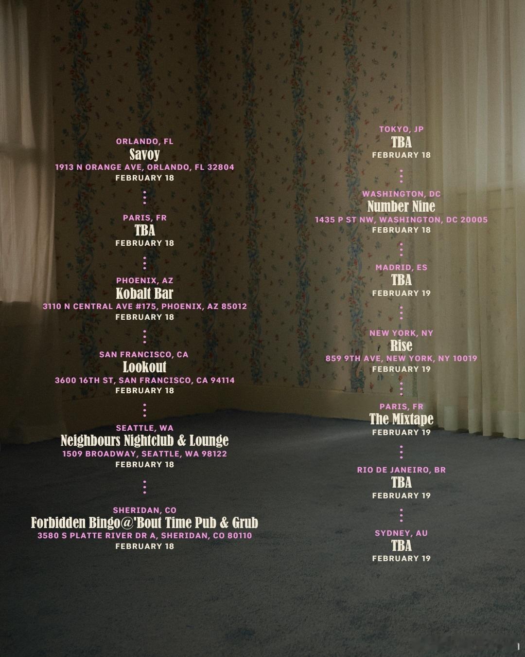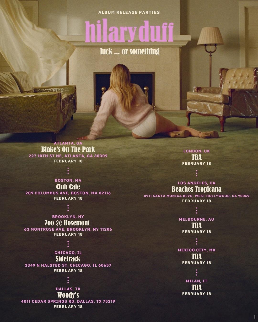 hilary duff希拉里达芙官宣日期,但非巡演,而是新专试听,2月18日将在世界各地的queer吧举办新歌抢先听活动,目前公布了美国各吧的地点,国际的即将公开【亚洲的有东京场