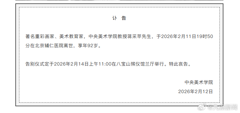 【#央美教授蒋采苹逝世#,享年92岁】2月12日,中央美术学院发布讣告:著名重彩画家、美术教育家,中央美术学院教授蒋采苹先生,于2026年2月11日19时50分在北京辅仁医院离世,享年92岁。